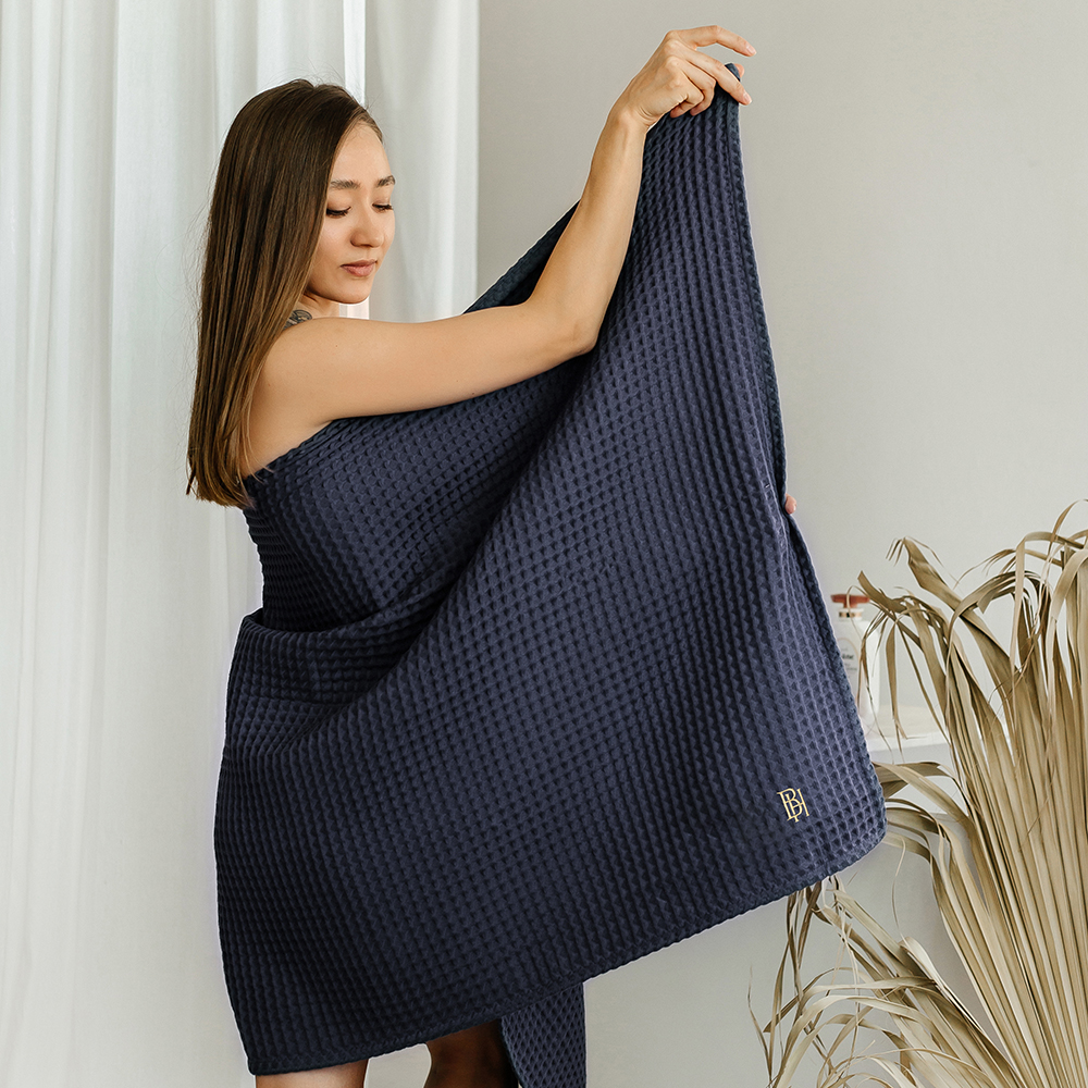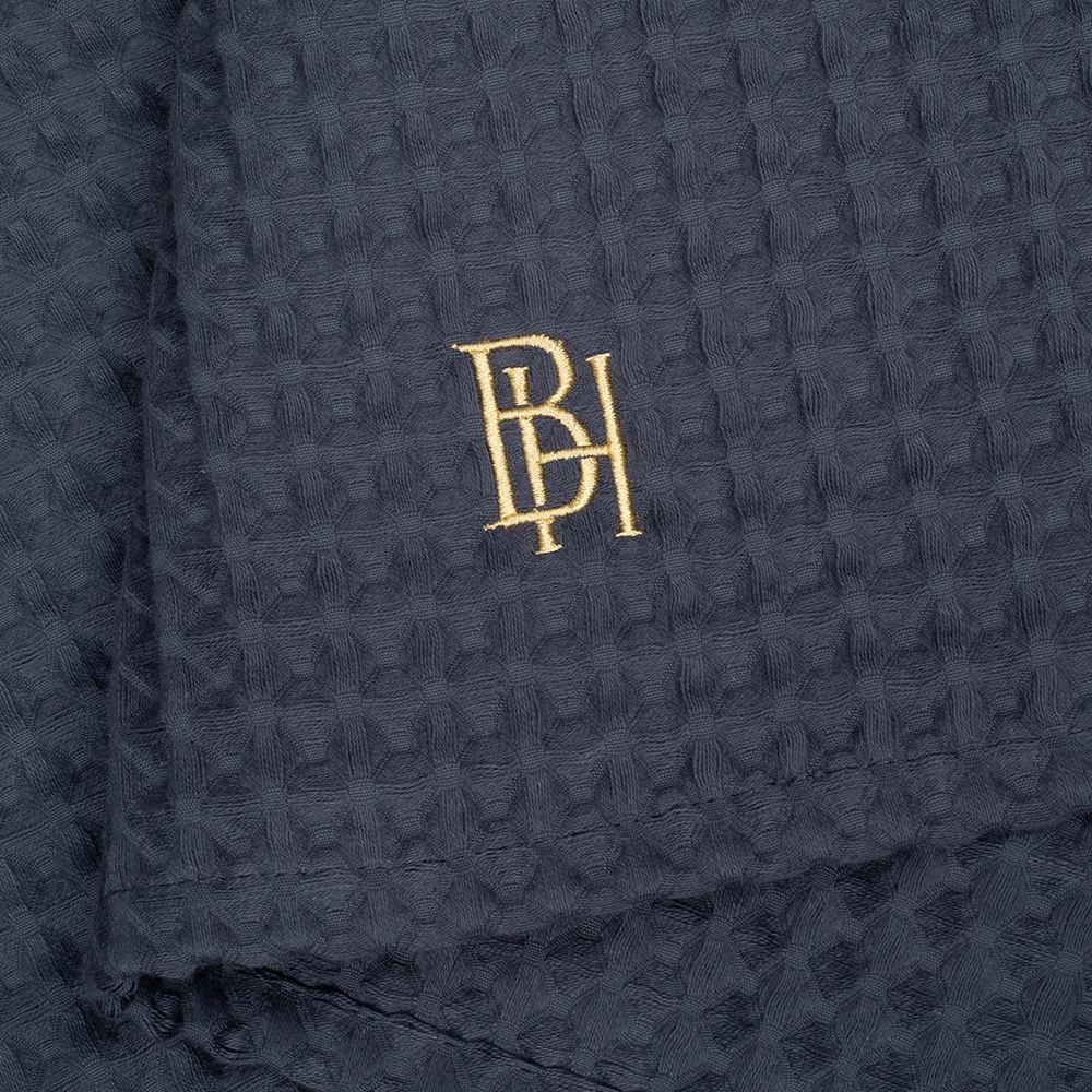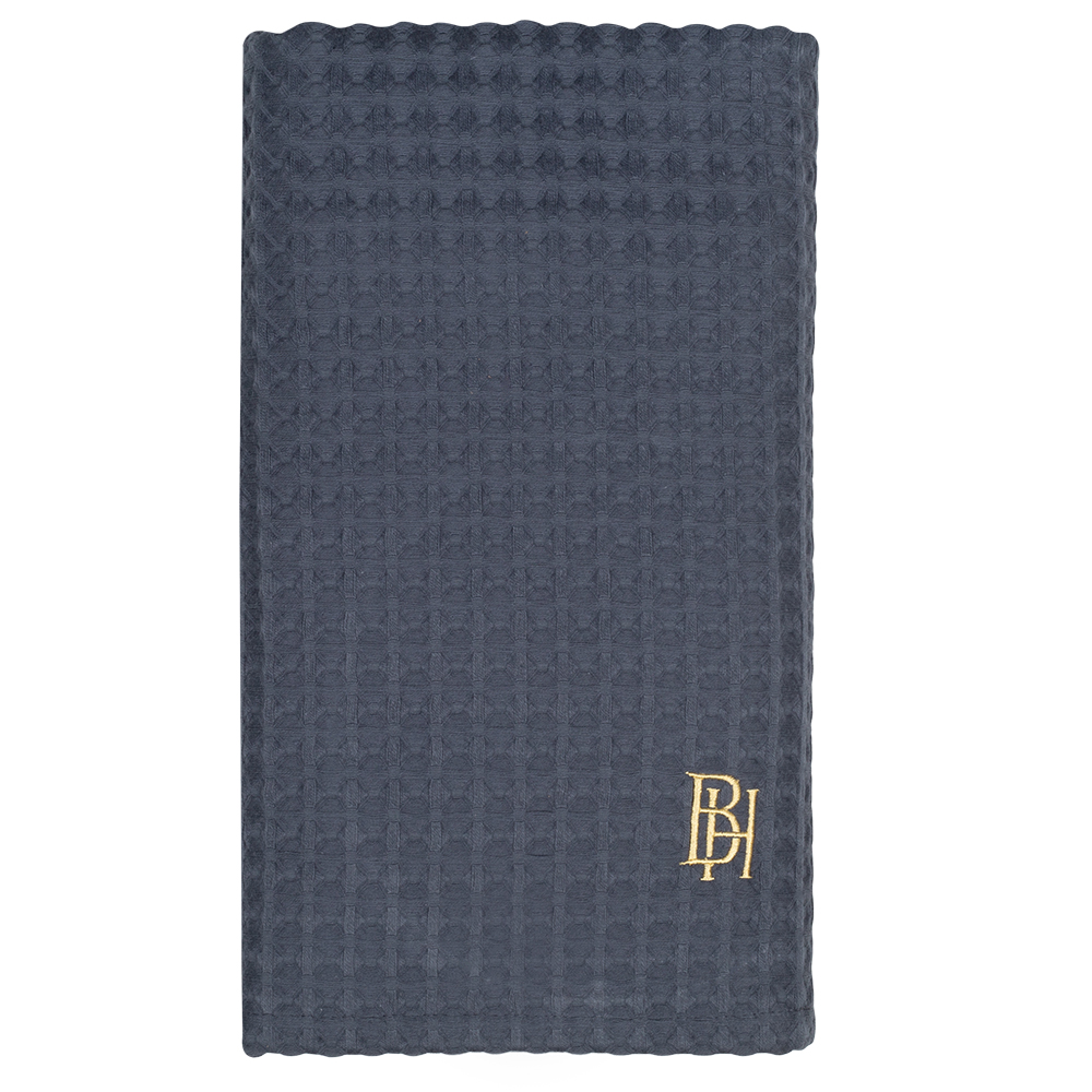 Полотенце вафельное Графит с вышивкой "BH" из нежнейшего 100% хлопка из новой коллекции Bellehome для ванной комнаты. Отличительной особенностью является оригинальная фирменная вышивка “BH”, в углу полотенца, которая гармонично сочетается с темным серо-синим цветом самой ткани. Натуральная ткань приятна к телу, обладает великолепными впитывающими свойствами, гипоаллергенно. Размер полотенца 90х160. Полотенце универсально в применении, подойдет и для детей и для взрослых, его можно использовать в бане, ванной, сауне, на пляже. На полотенце имеется удобная, прочная петелька посередине длинной стороны изделия. Полотенце можно стирать в машине, обладает прекрасной износостойкостью.