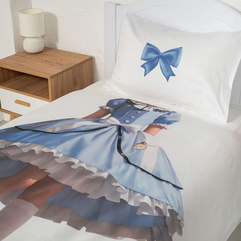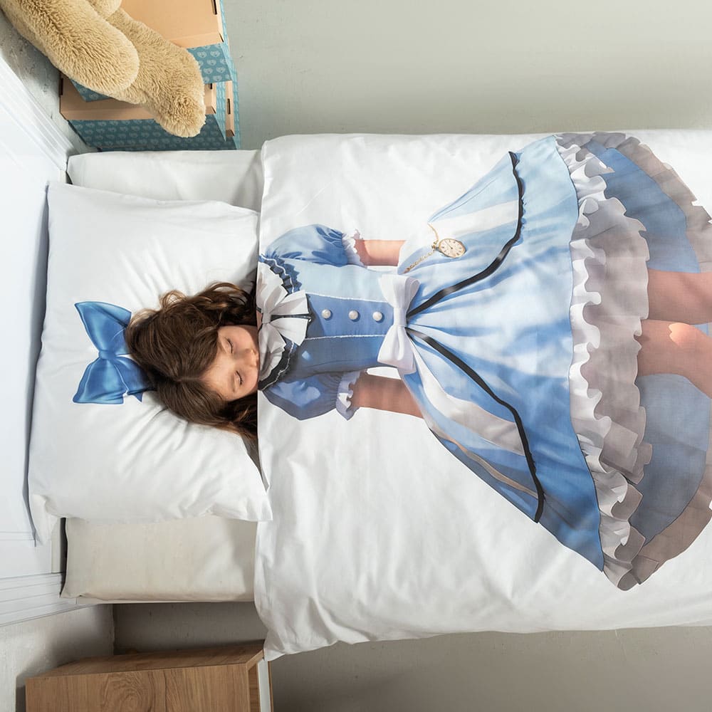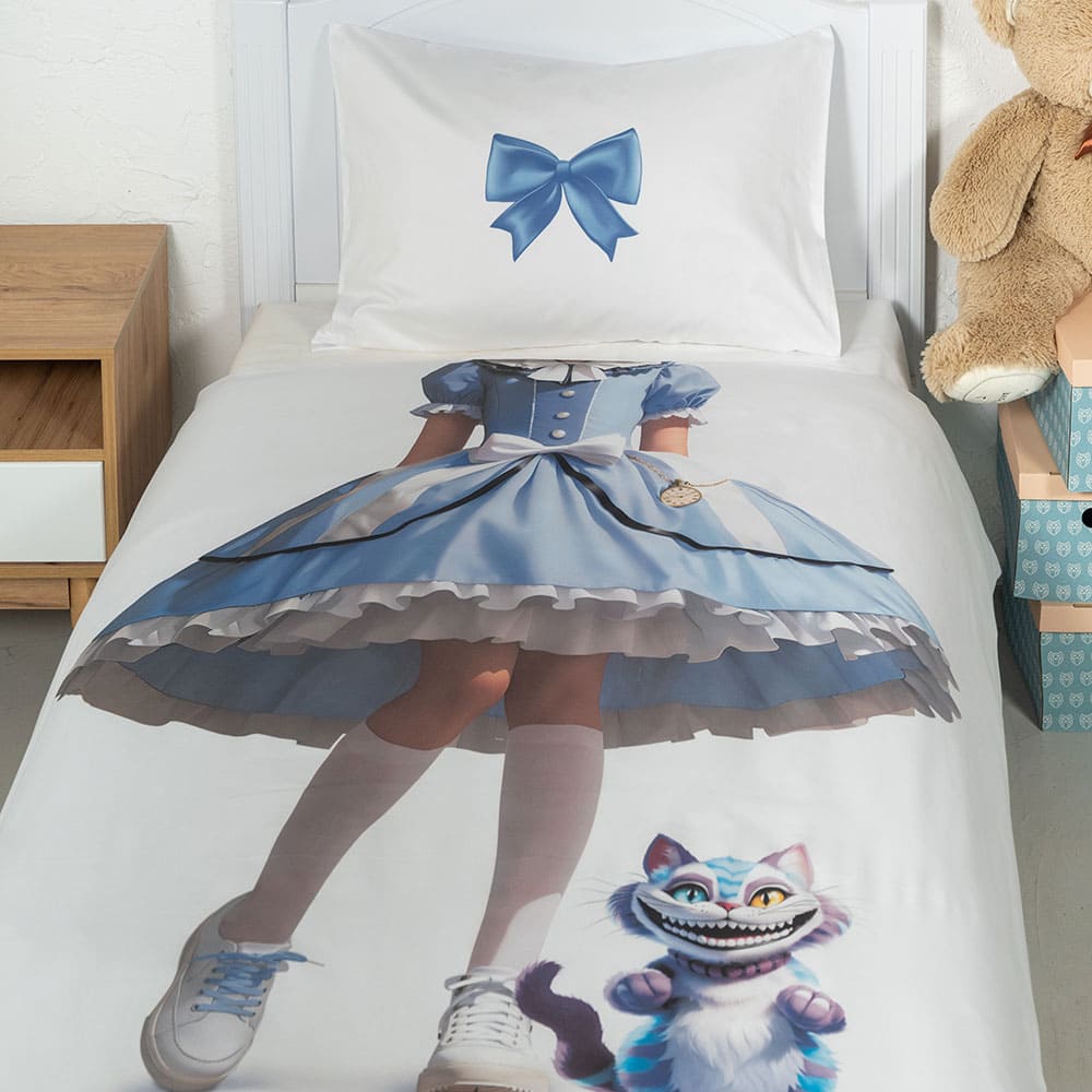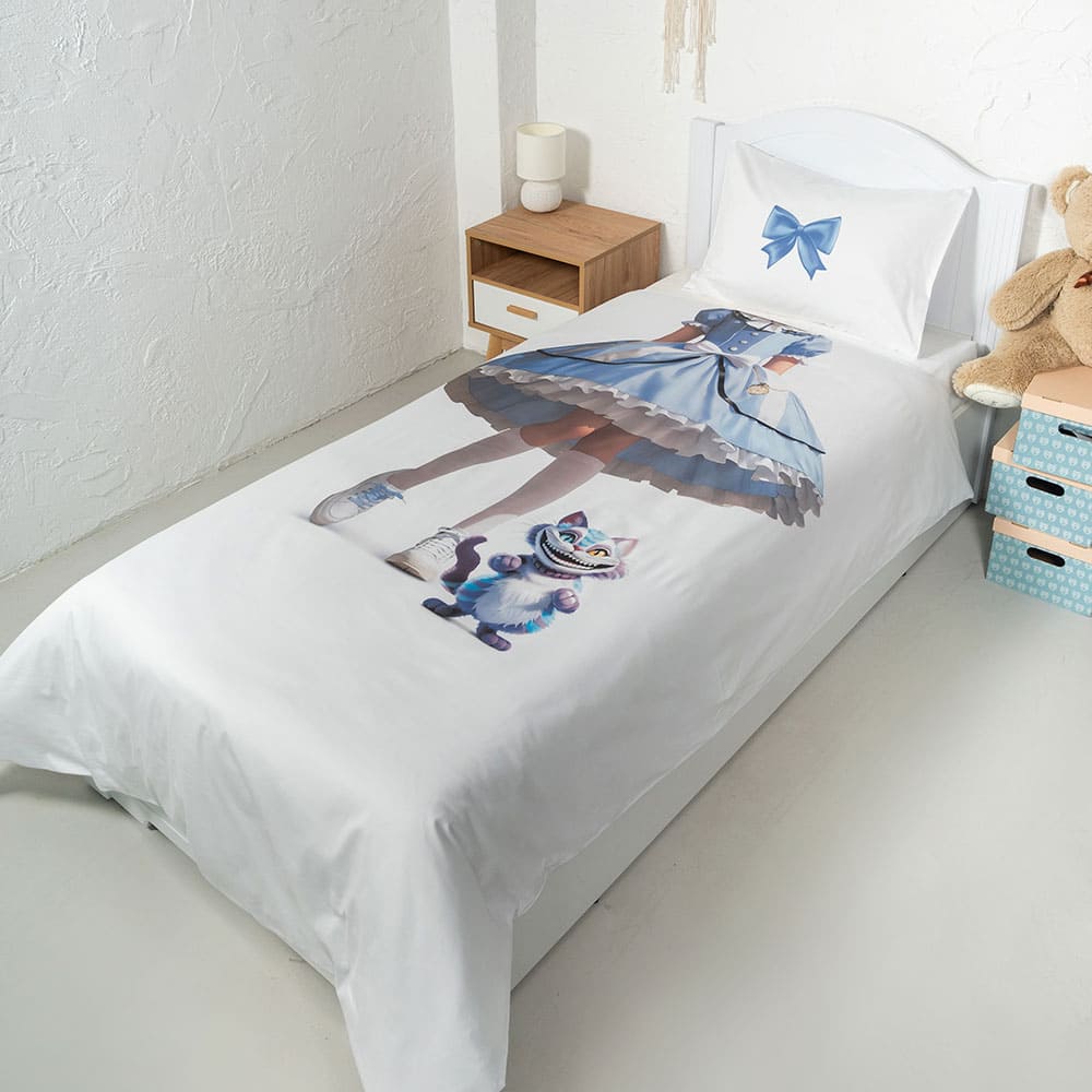 Ткань изготовлена из 100% длинноволокнистого хлопка, сатинового переплетения высокой плотности 200ТC. Комплект постельного белья по тактильным ощущениям мягкий и гладкий, с шелковистым блеском. Натуральные волокна не вызывают раздражения кожи, ткань отлично пропускает воздух. Постельное белье "Мама, я Алиса" выполнено в классическом белом цвете. На лицевой стороне наволочки и пододеяльника изображена Алиса из Страны чудес.