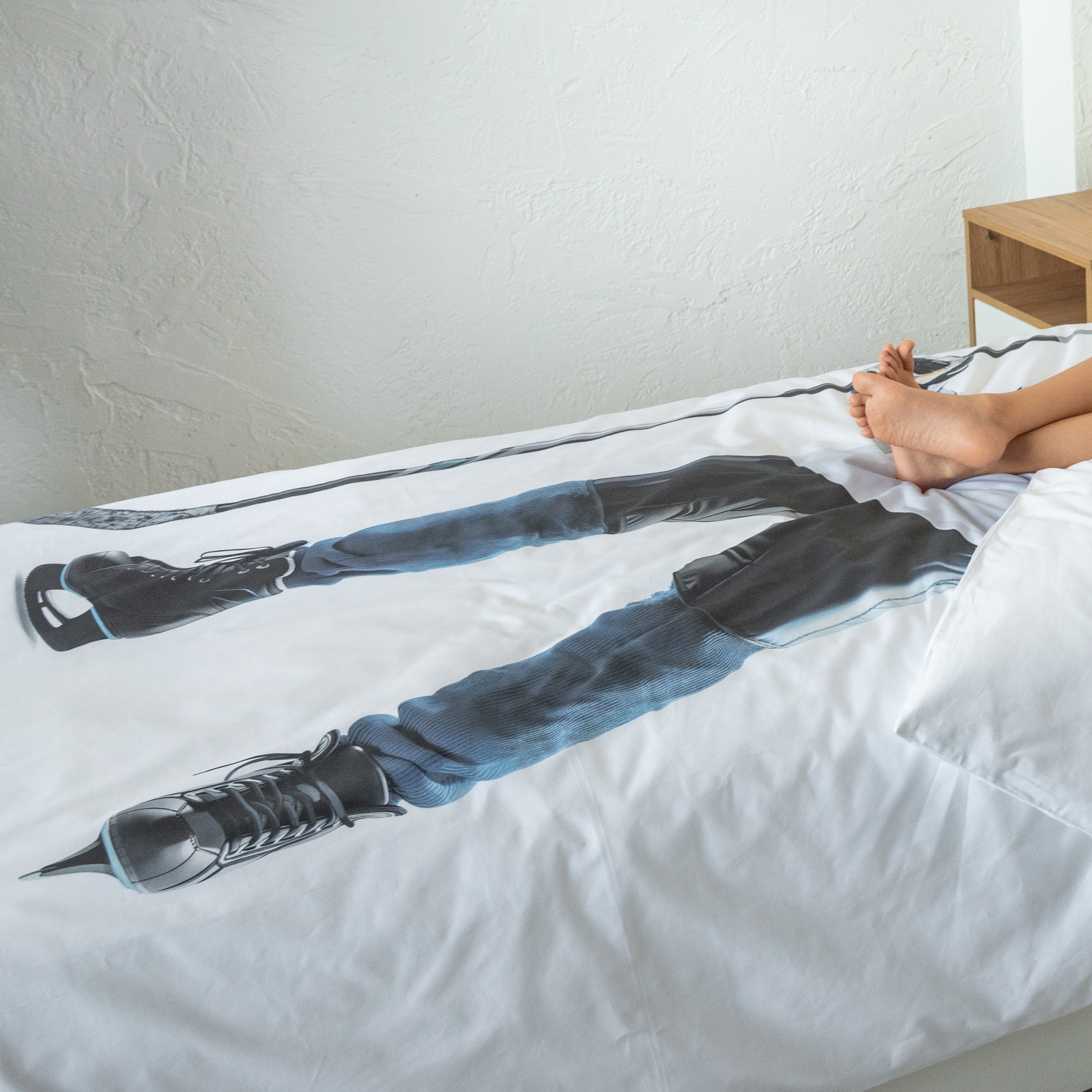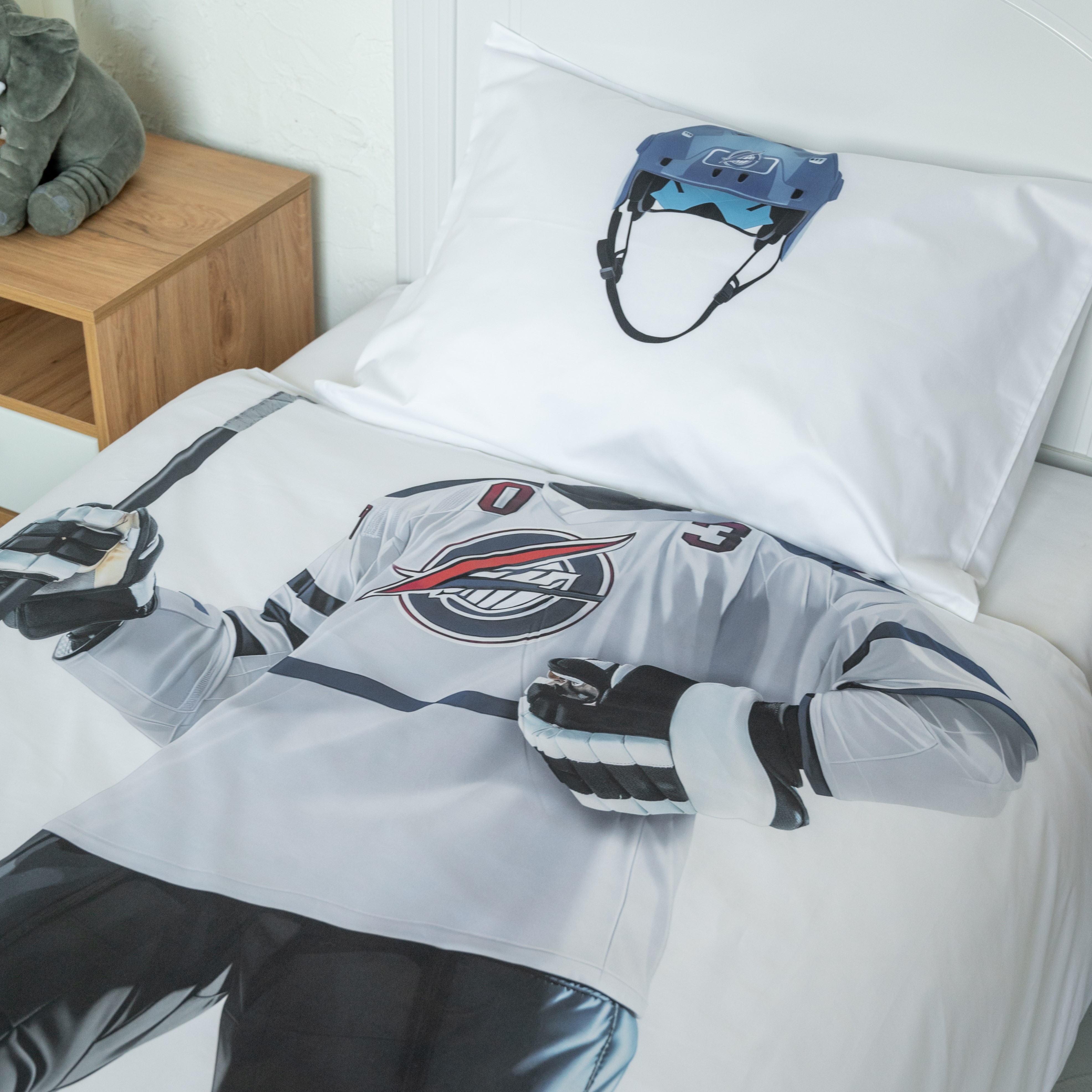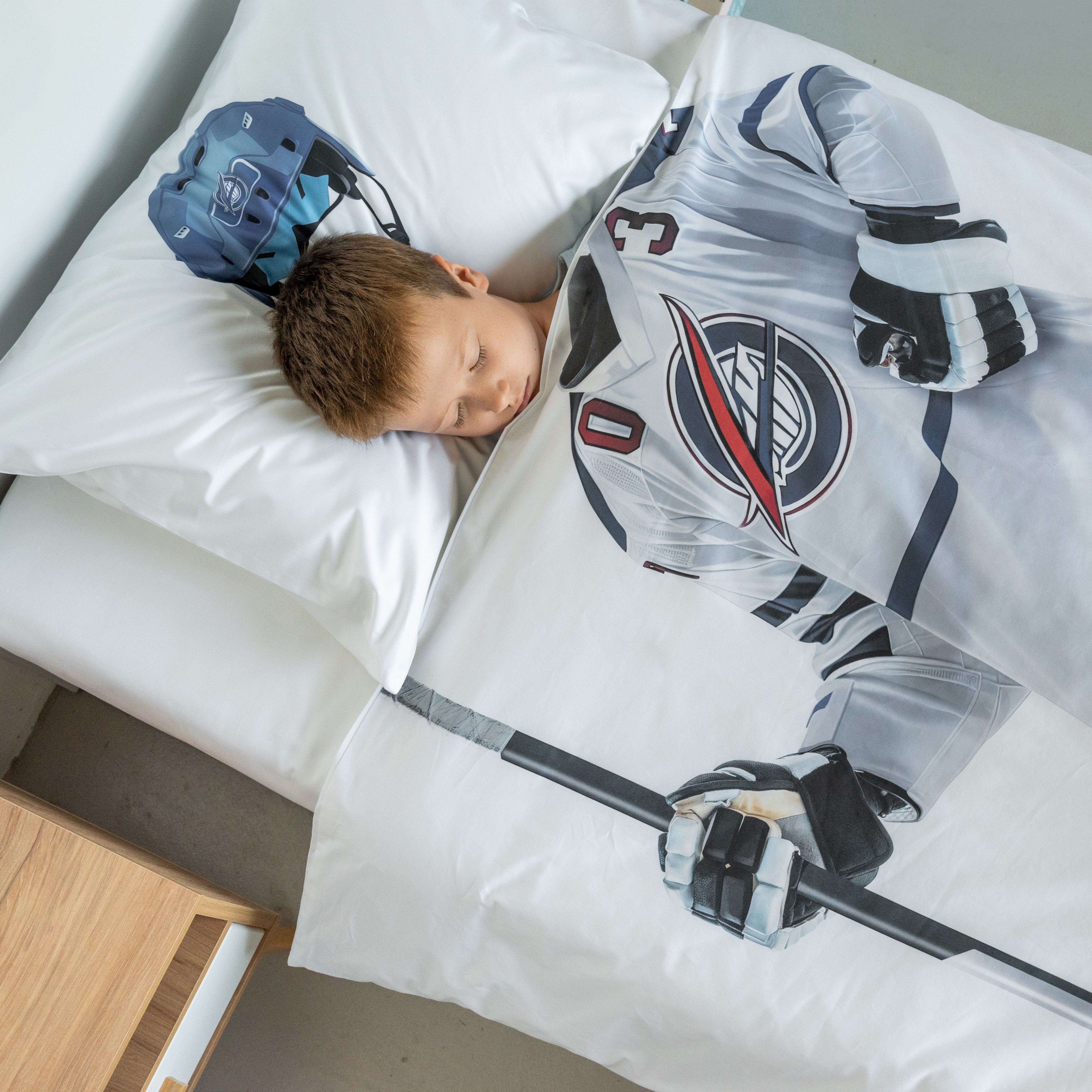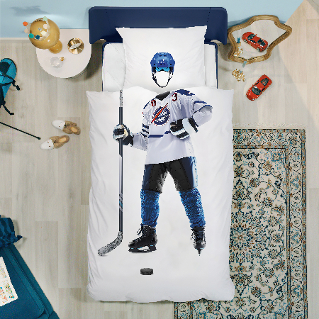 Ткань изготовлена из 100% длинноволокнистого хлопка, сатинового переплетения высокой плотности 200ТC. Комплект постельного белья по тактильным ощущениям мягкий и гладкий, с шелковистым блеском. Натуральные волокна не вызывают раздражения кожи, ткань отлично пропускает воздух. Постельное белье "Мама, я Хоккеист" выполнено в классическом белом цвете. На лицевой стороне наволочки и пододеяльника изображен уверенный хоккеист.