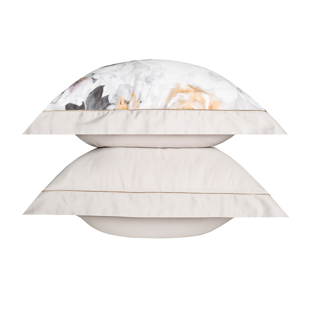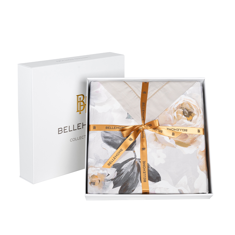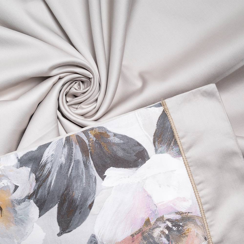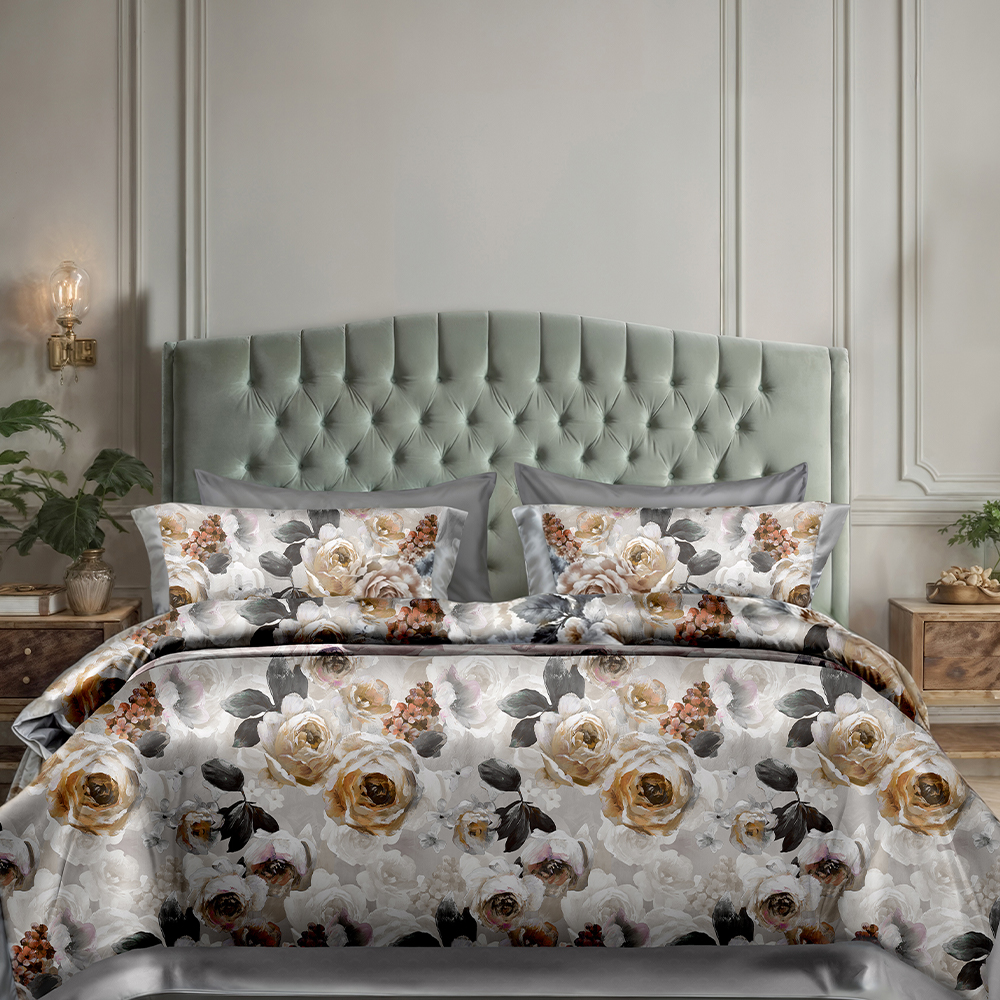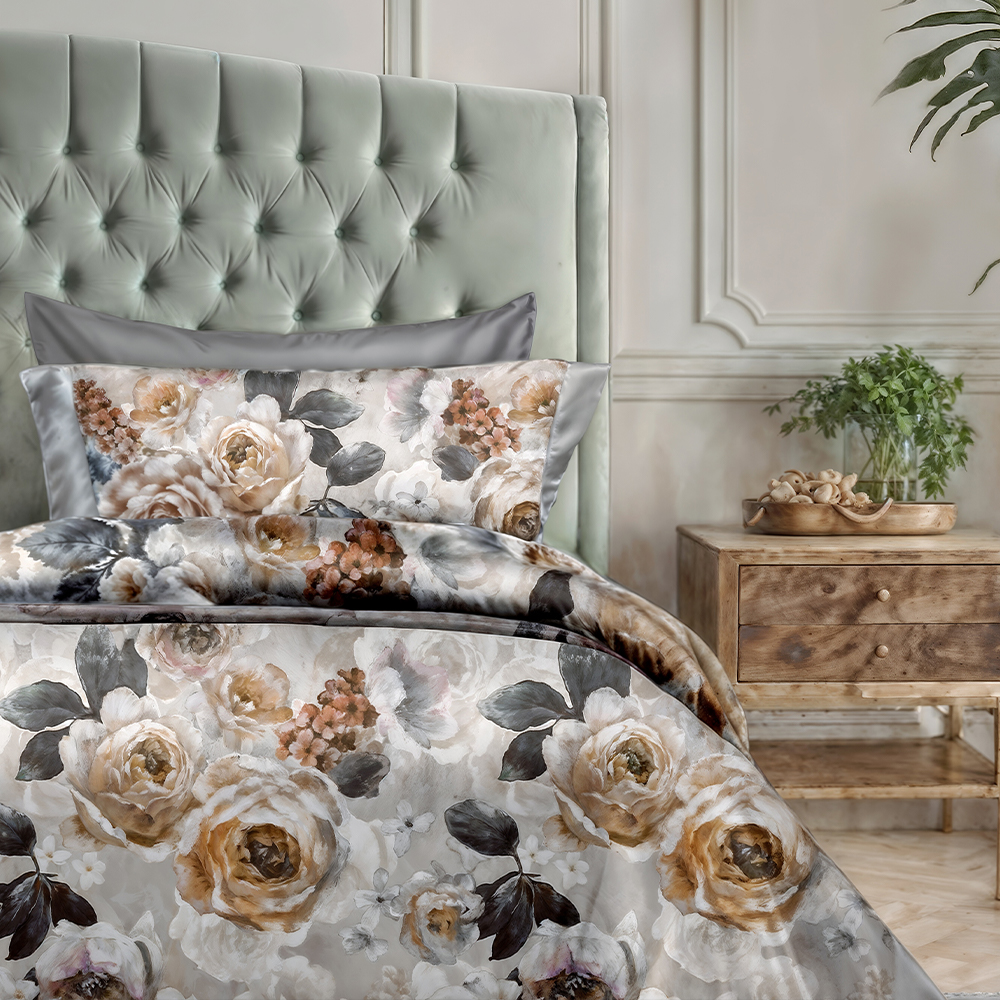 Постельное белье с невероятным сатиновым блеском в сером цвете дополняют крупные бутоны роз.