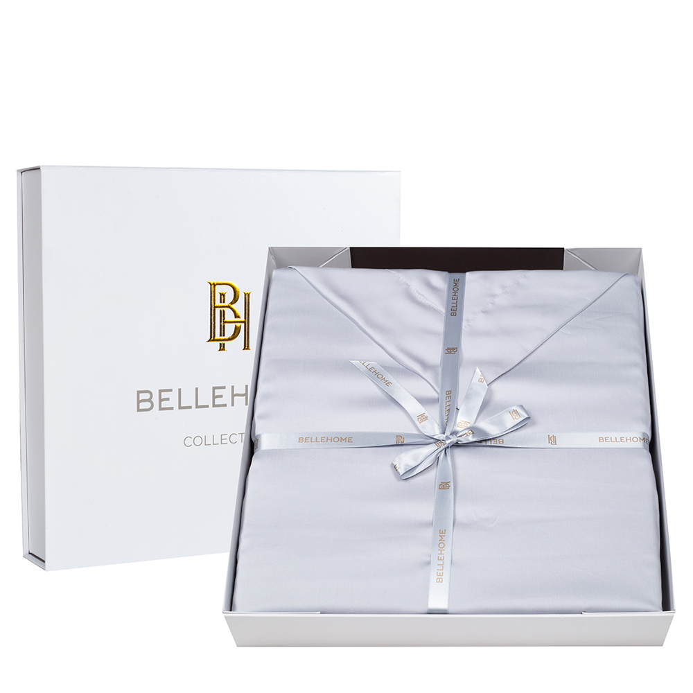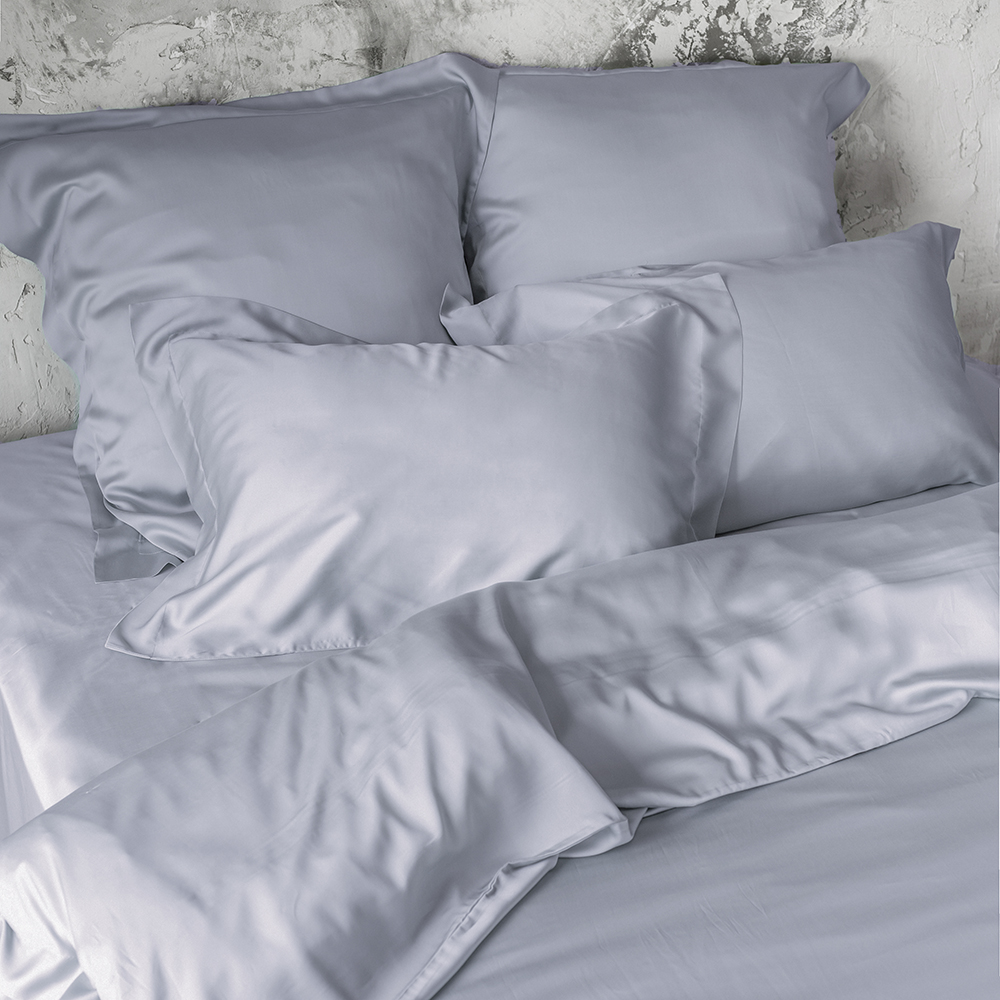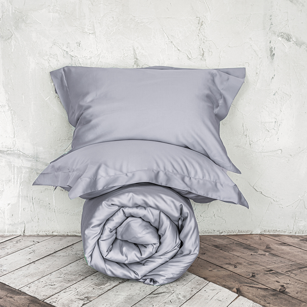 Комплект выполнен в элегантном и лаконичном однотонном дизайне нежного серо-голубого оттенка. Наволочки и пододеяльник оформлены в классическом «оксфордском» стиле с бордюром 5 см по окантовке.