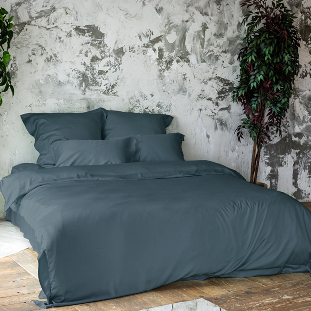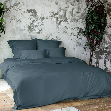 Комплект выполнен в элегантном и лаконичном однотонном дизайне благородного серо-синего оттенка. Наволочки и пододеяльник оформлены в классическом «оксфордском» стиле с бордюром 5 см по окантовке.