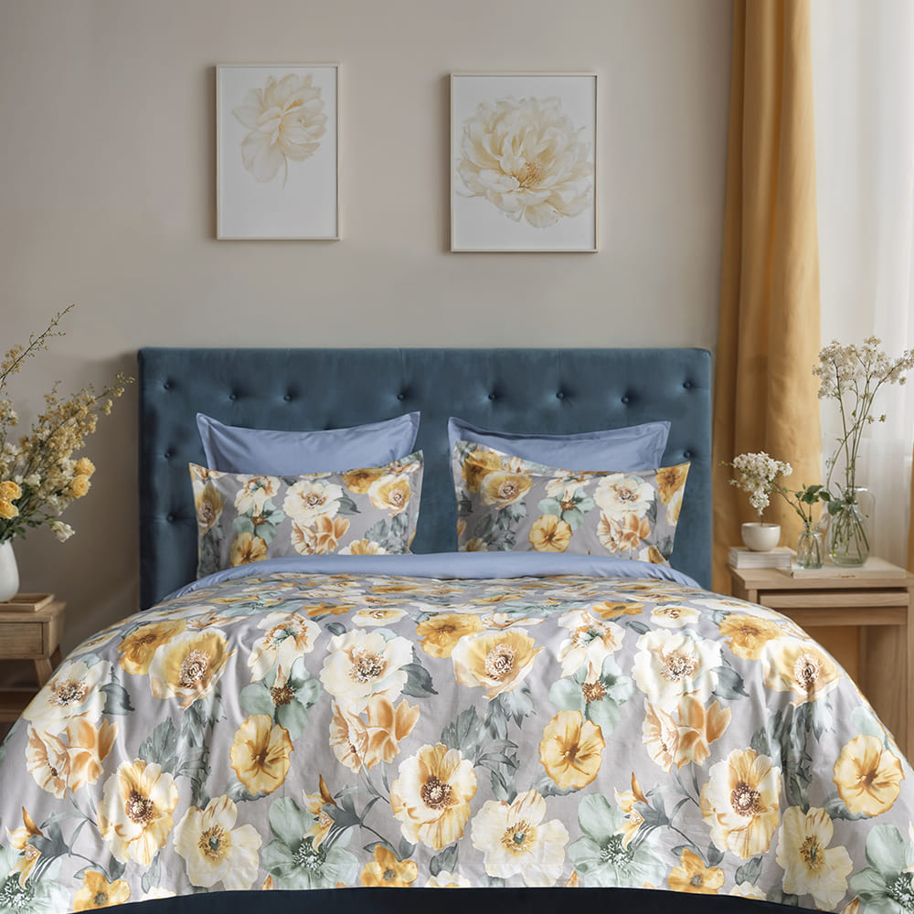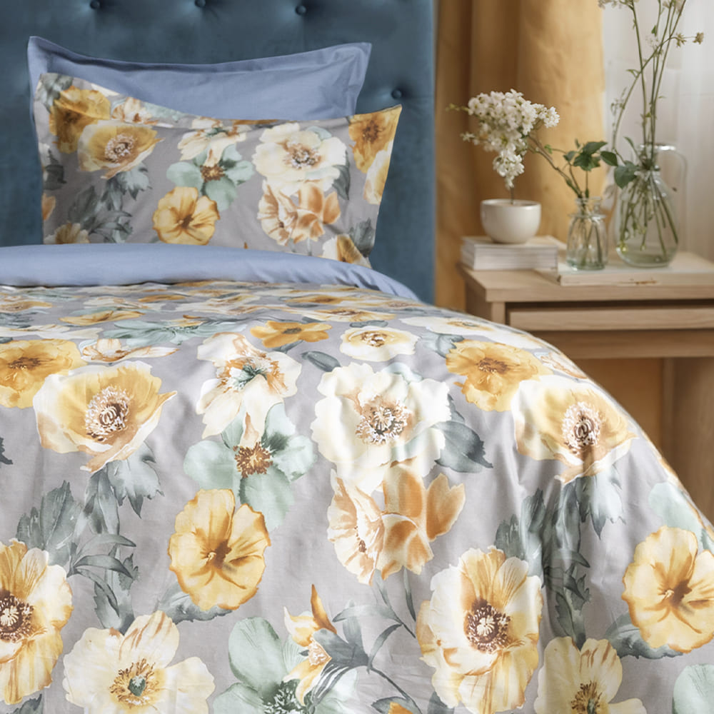 Дизайн комплекта Фелита выполнен с помощью digtal-печати принта. Постельное белье навеивает ассоциации с яркими лугами весенней поляны, где царит атмосфера безмятежности и спокойствия. Цветовое решение комплекта сделано в прекрасном сочетании контрастных оттенков и изображений оранжевых маков, а тыльная сторона дополнена благородным синим оттенком.