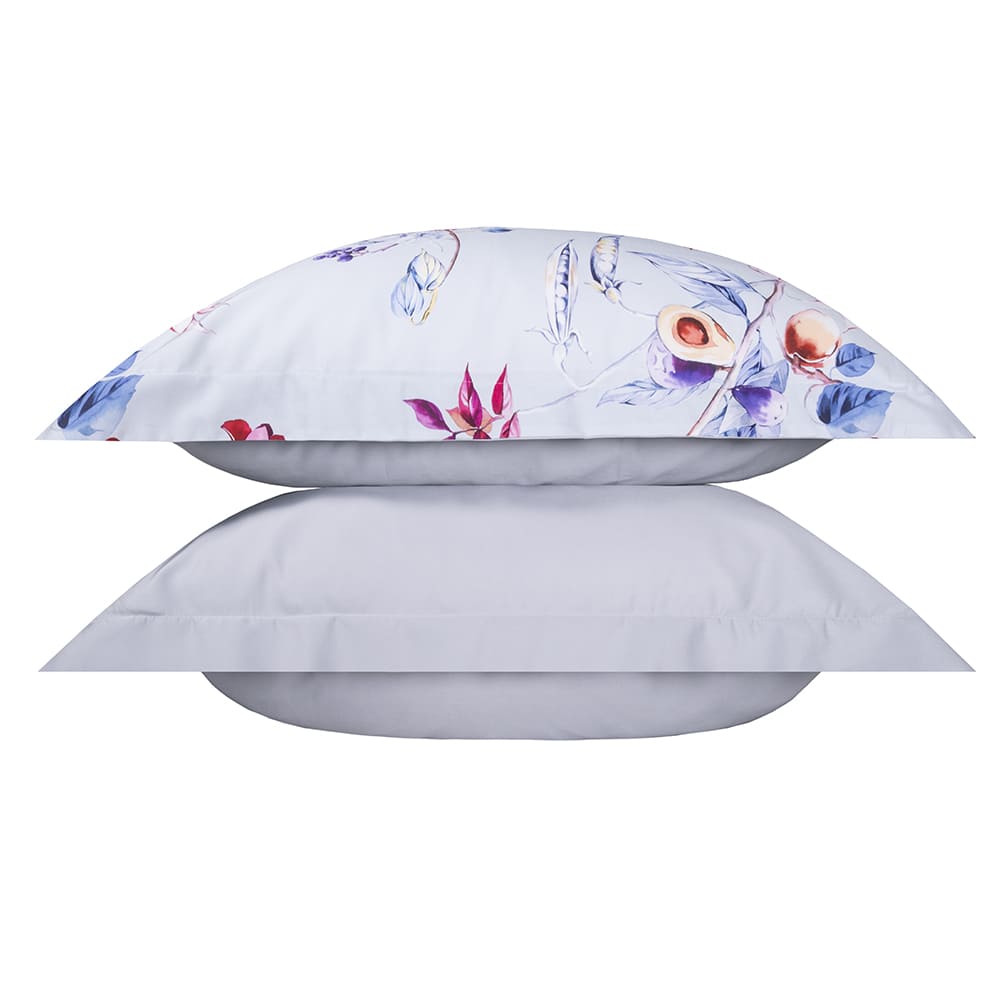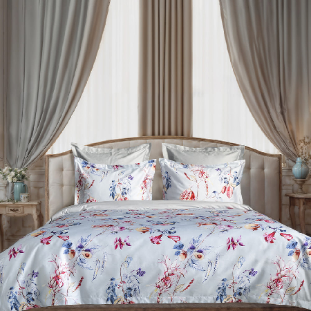 Постельное белье в нежно-голубом цвете украшает воздушная лоза с контрастными цветами и плодами сочного граната, тыльная сторона спокойного серого цвета.