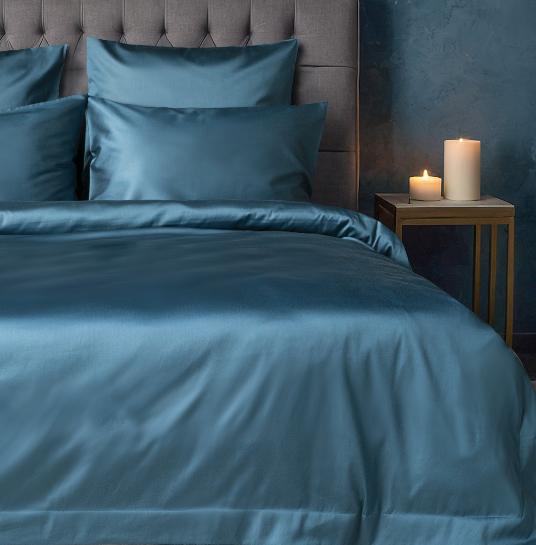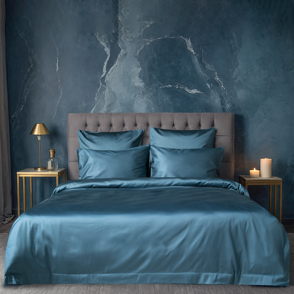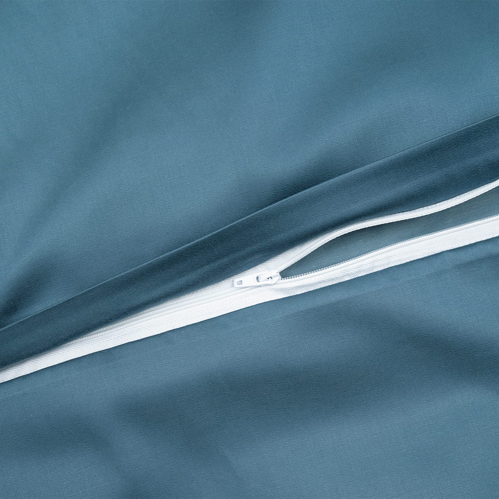 Комплект представлен в благородном оттенке синего. Однотонная цветовая гамма и утонченный блеск придают спальне особую атмосферу роскоши. Завершенный образ создают наволочки. Они украшены декоративными бортиками по периметру, а их удобный широкий запах позволяет легко менять белье. Пододеяльник на змейке.