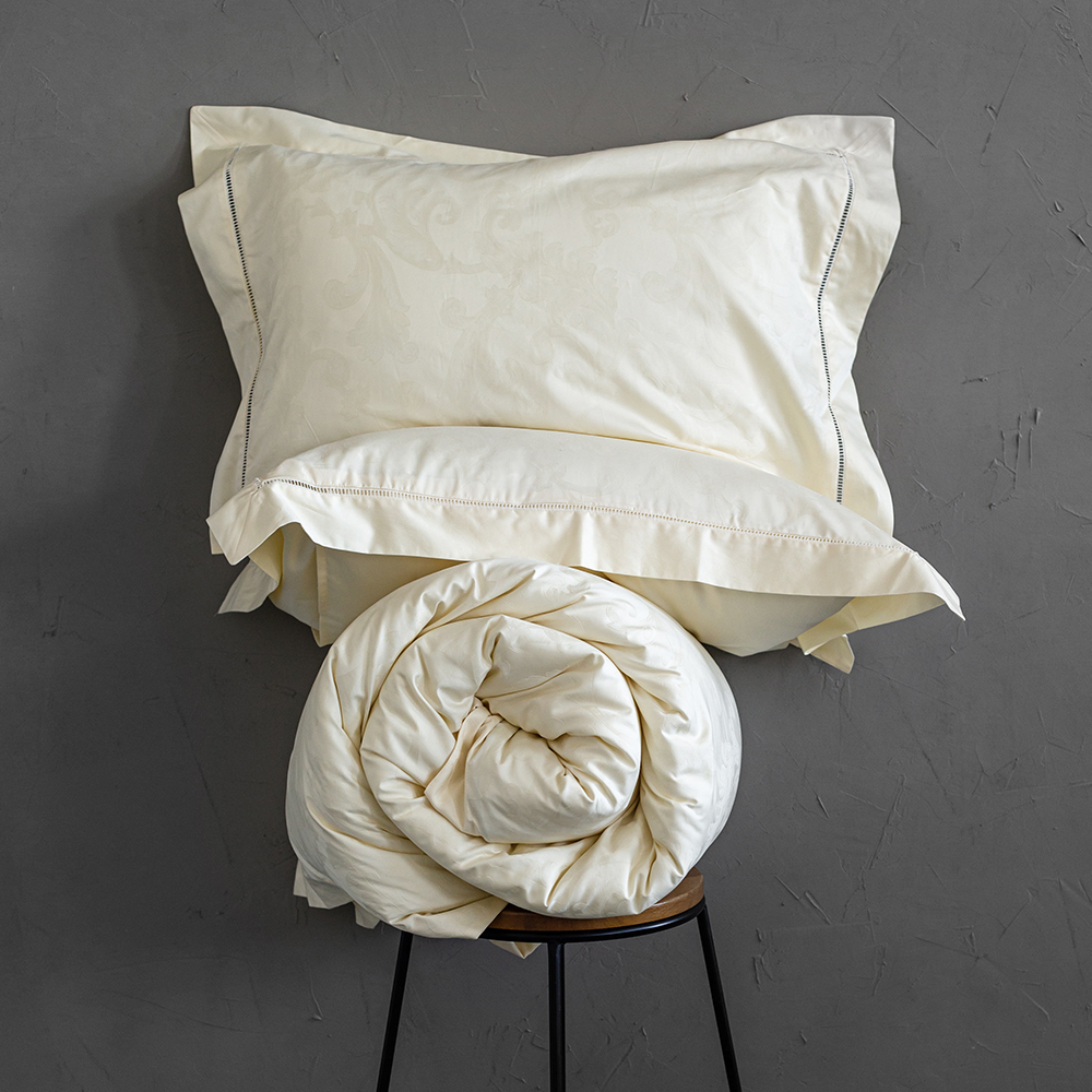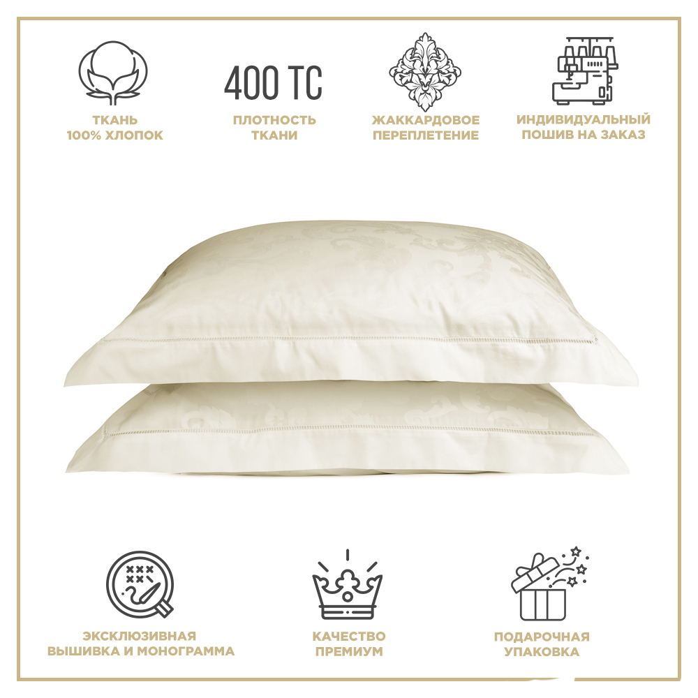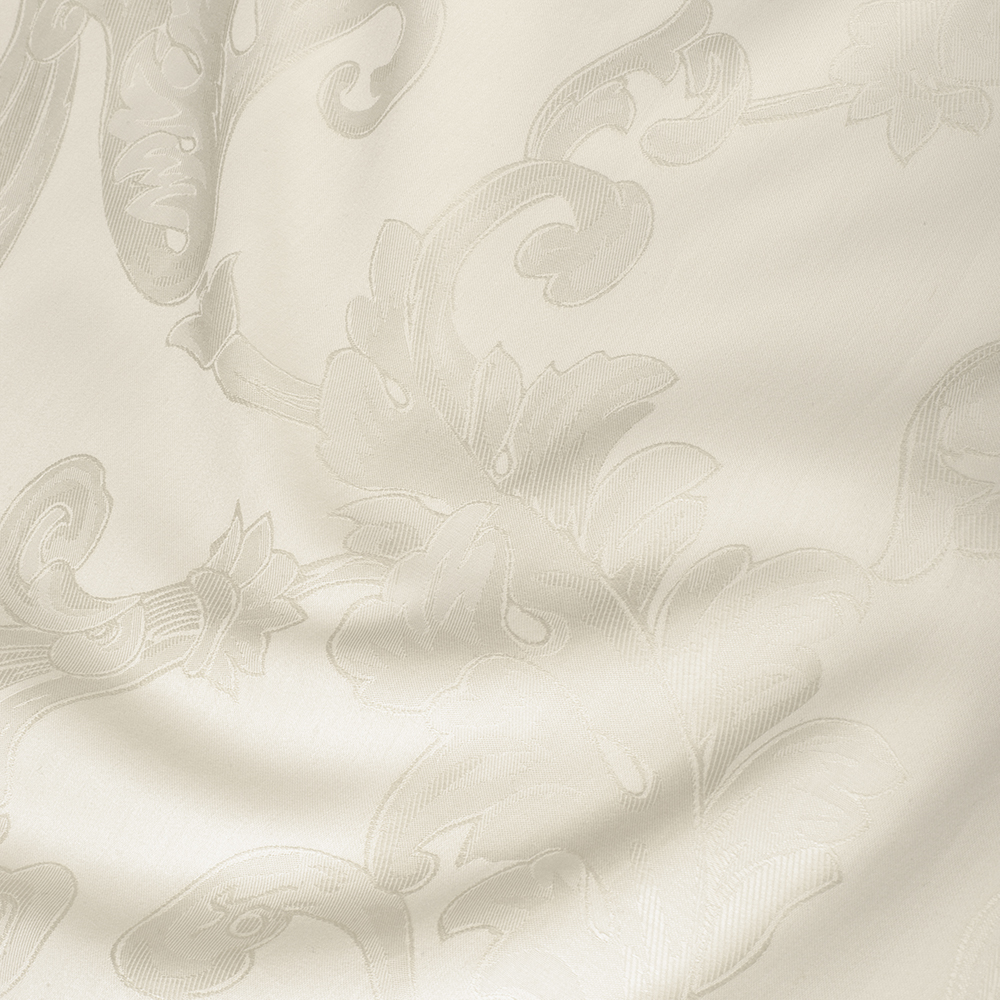 Комплект постельного белья изготовлен из 100% жаккарда нежного кремового цвета. Самая изысканная и нежная ткань жаккард состоит из сложного переплетения, в результате которого получается невероятно плотная, износостойкая, гладкая и красивая ткань с элегантным рельефным орнаментом плотностью в 400ТС.