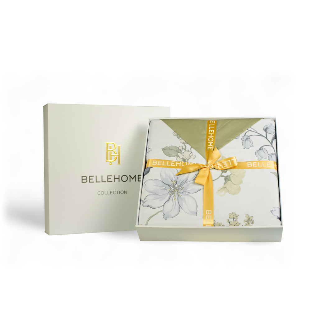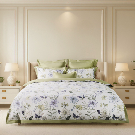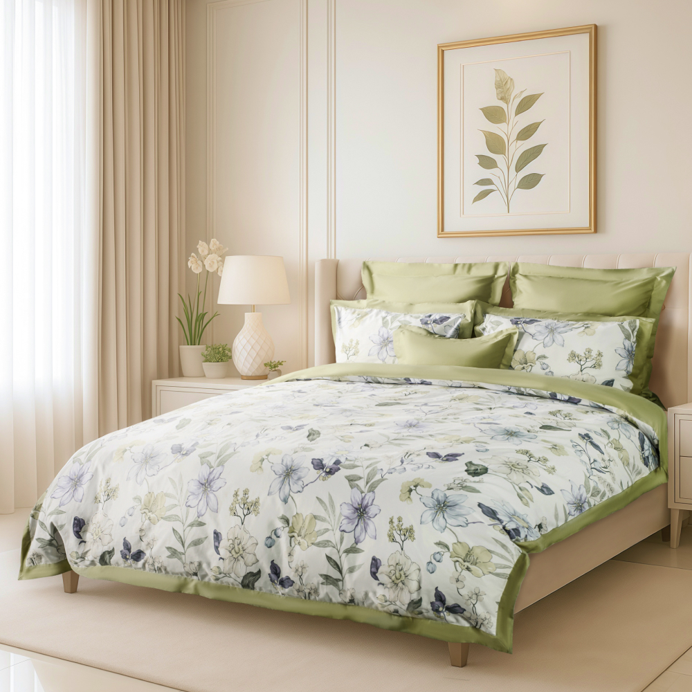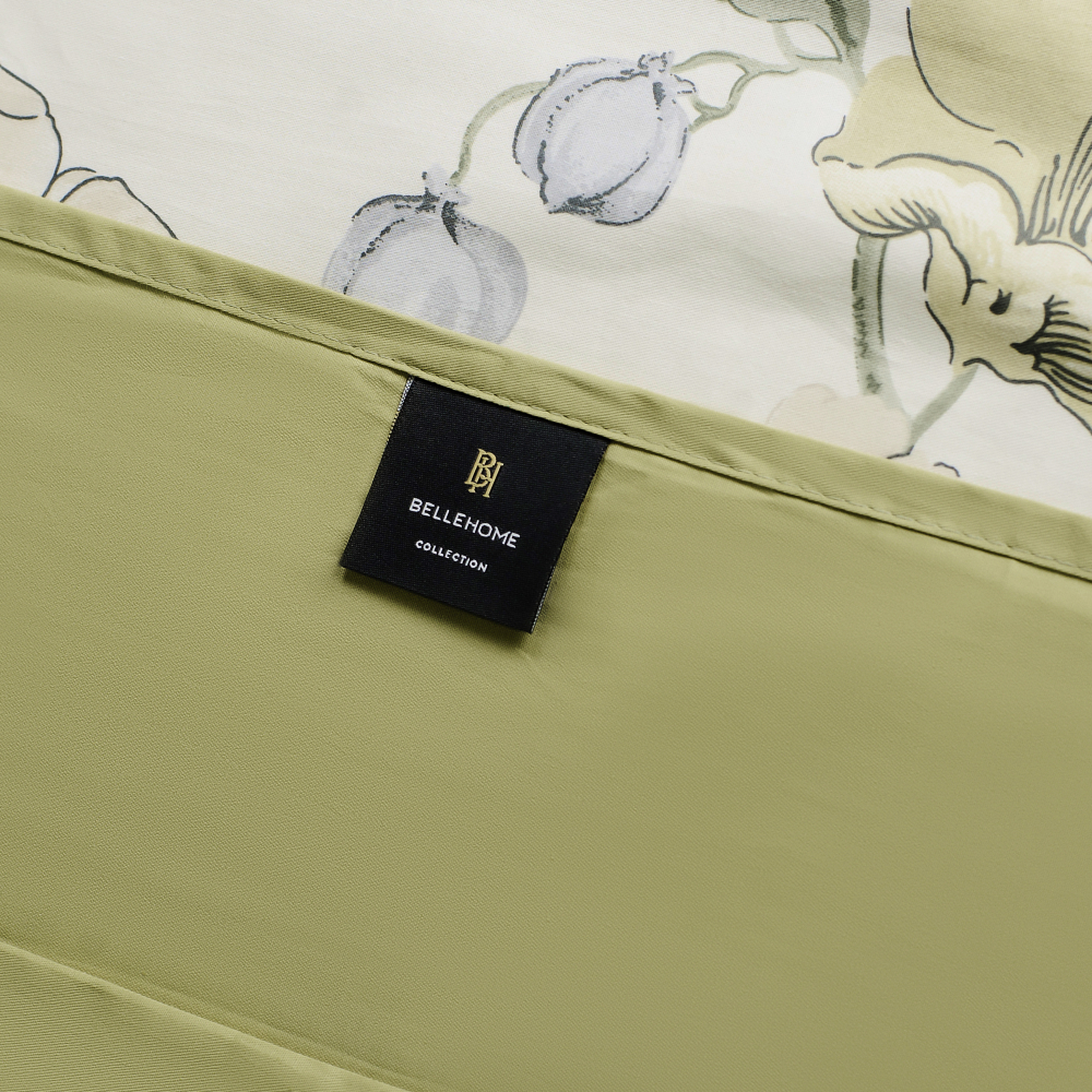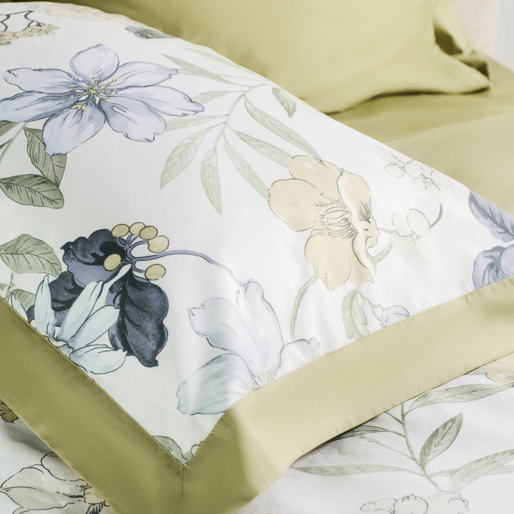 Дизайн комплекта создают ткани-компаньоны двух цветов: лицевая сторона украшена изысканным растительным принтом с изображением цветов и листьев в оттенках синего, зелёного и жёлтого., а тыльная выполнена в нежном оливковом цвете. Такой комплект станет прекрасным дополнением к интерьеру спальни, создавая атмосферу уюта и элегантности.