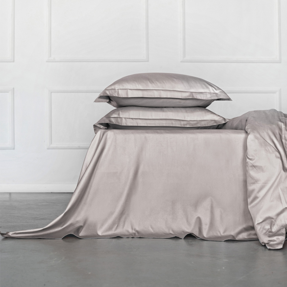 Простыня Shiny Mist выполнена в элегантном и лаконичном однотонном дизайне серо-бежевого цвета в размерах 200х220 см и 250х245 см.