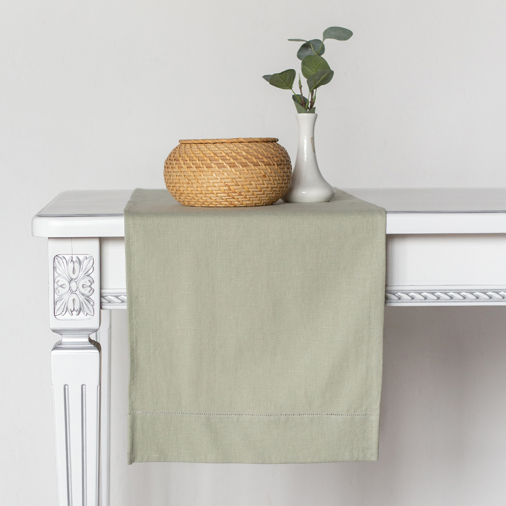 Дорожка столовая lin/cotton Crystal Green имеет классическую прямоугольную форму, по бордюру украшена лаконичной мережкой.