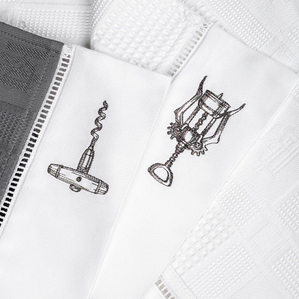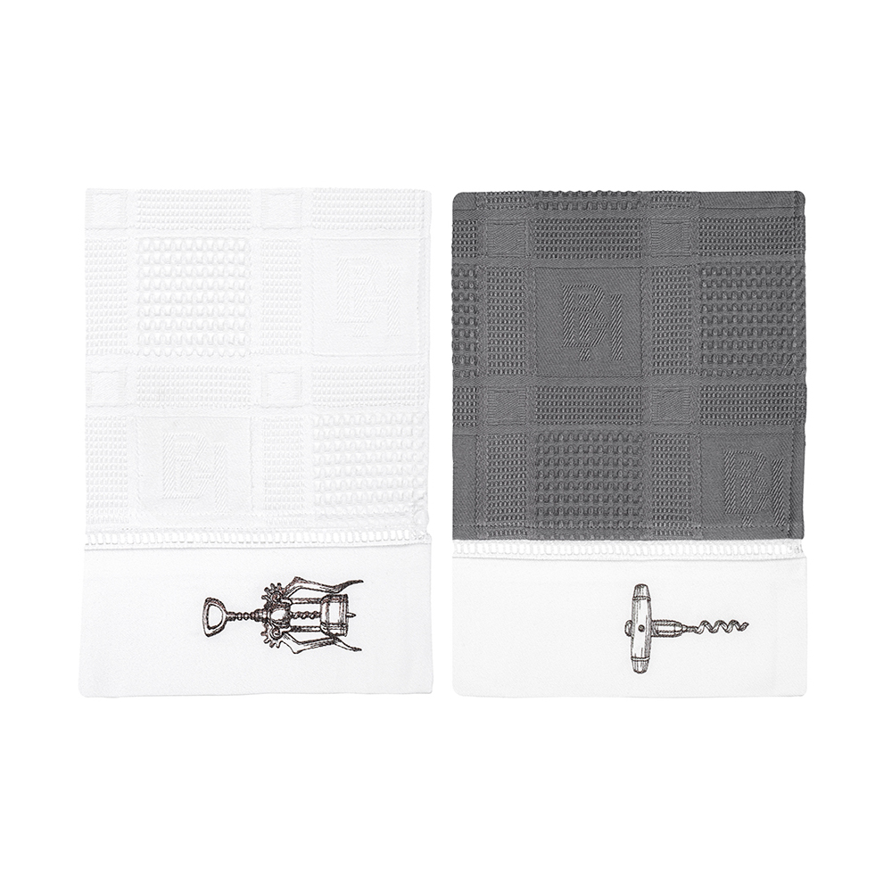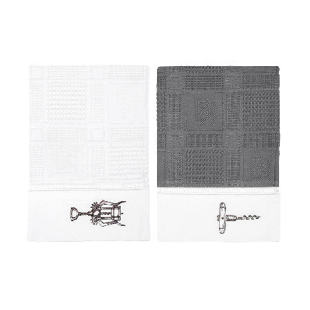 Комплект «Wine opener» выполнен из высококачественного хлопка белого и графитового цвета, по бордюру украшены лаконичной мережкой и хлопковым бортиком с вышивкой в виде ручного и механического штопоров. Вафельные полотенца BELLEHOME — это практичность, комфорт и уют!