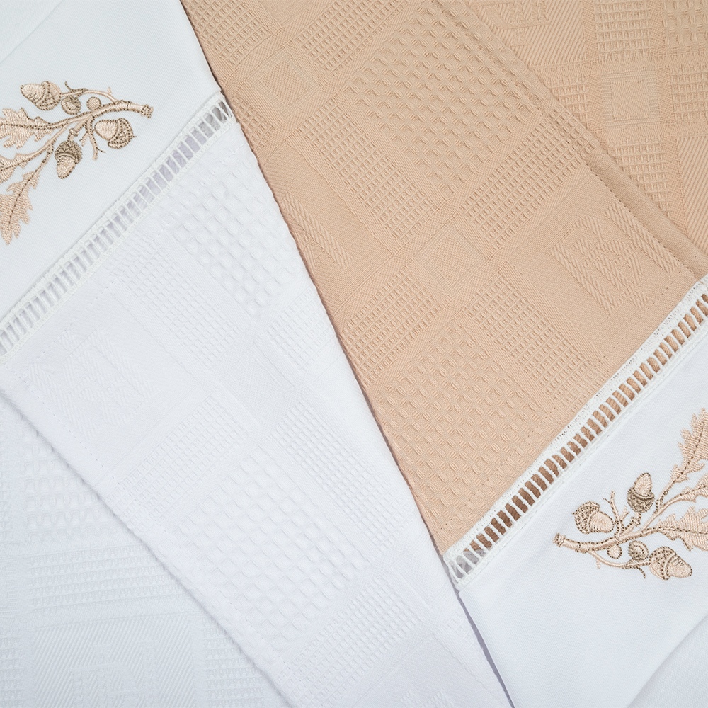 Вафельные полотенца для кухни с вышивкой «Oaks» — красивый и практичный элемент столового текстиля. Объемная фактура в виде квадратных ячеек позволяет ткани легко и быстро впитывать влагу. Изготовлены из 100% хлопка, мягкие и приятные на ощупь. Благодаря высокой плотности, устойчивы к изнашиванию и могут активно использоваться в быту.