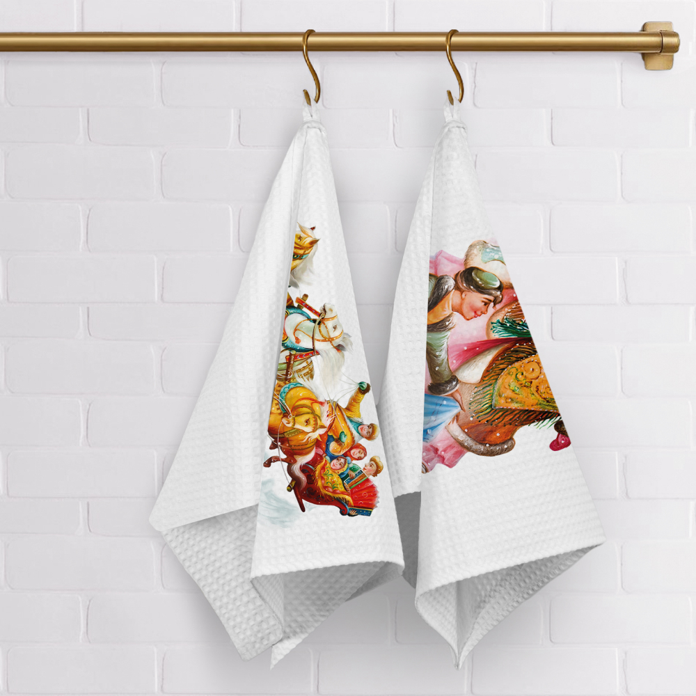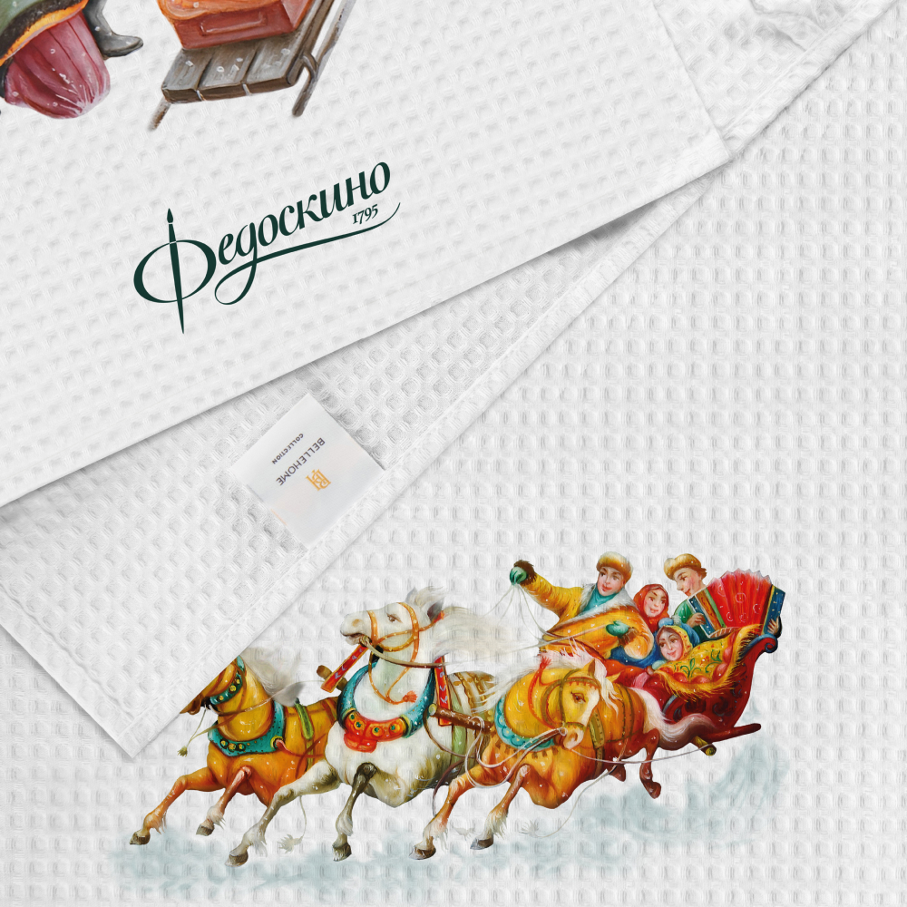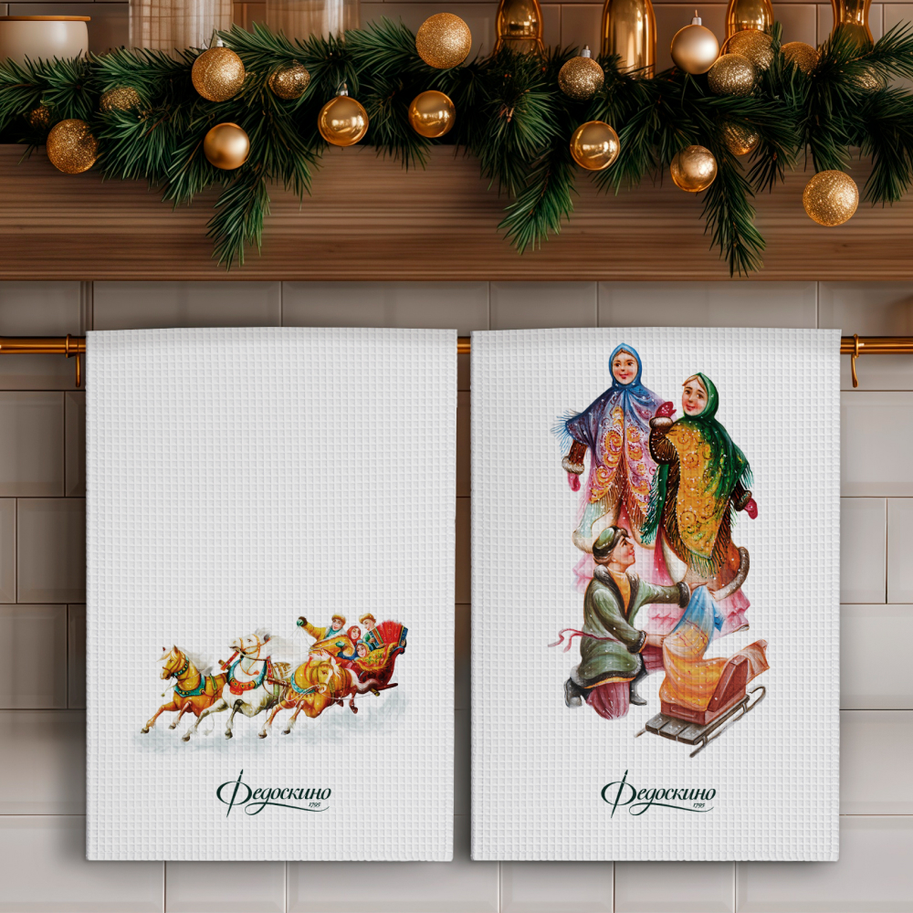 Набор Зимние забавы "Федоскино" включает два вафельных полотенца из высококачественного хлопка, украшенных традиционными мотивами Федоскинской миниатюры. Одно полотенце переносит нас на бодрящий морозный воздух, где лихая тройка лошадей с бубенцами мчит нарядные сани по искристому снегу. Второе полотенце запечатлело момент момент: две девушки и юноша в красочных национальных костюмах — словно сошли со страниц сказки, воплощая образы искреннего веселья и гостеприимства. Вместе эти сцены создают полную, живую картину русских зимних традиций.