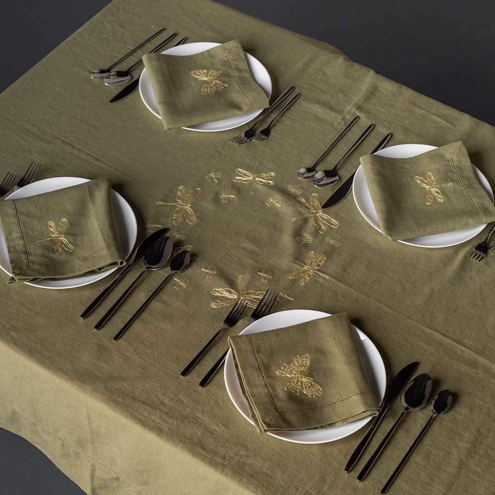 Комплект салфеток столовых с вышивкой из серии Golden wings, имеют классическую квадратную форму, по бордюру украшены лаконичной мережкой, и оригинальной дизайнерской вышивкой в виде воздушных бабочки и стрекоз.