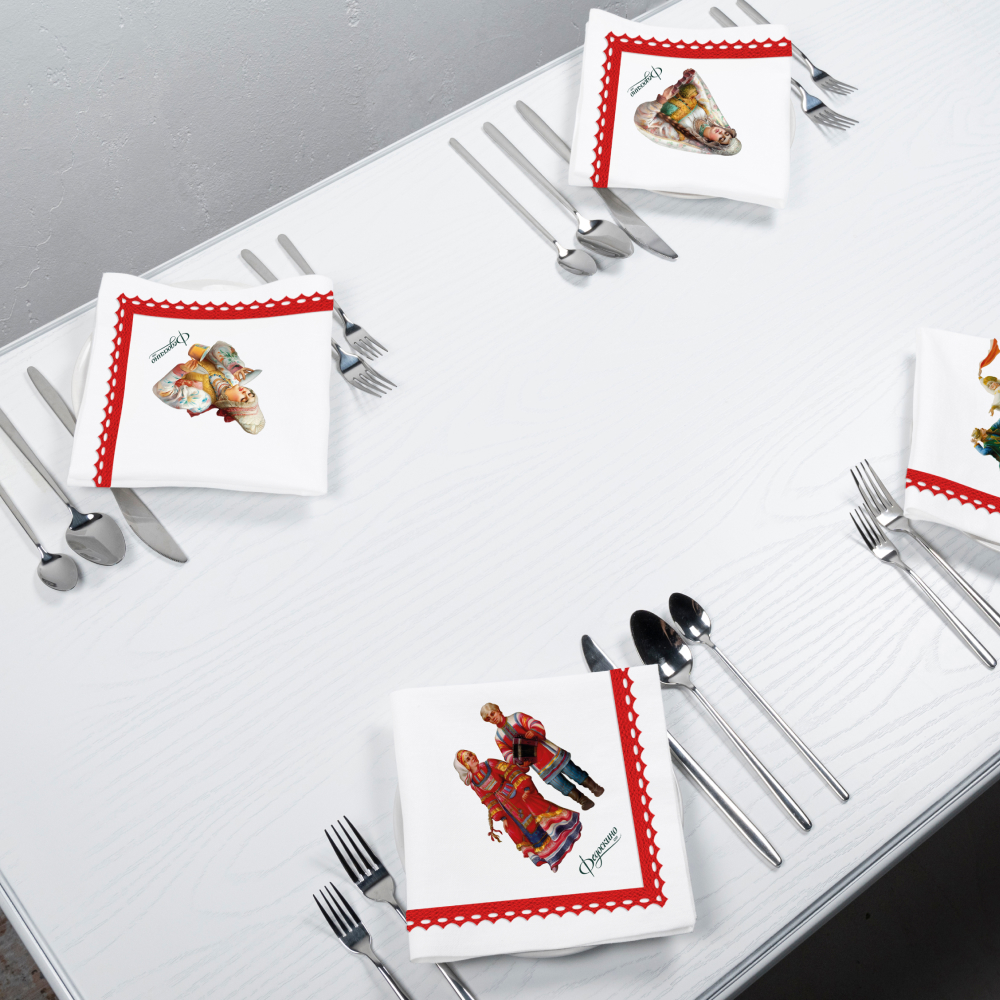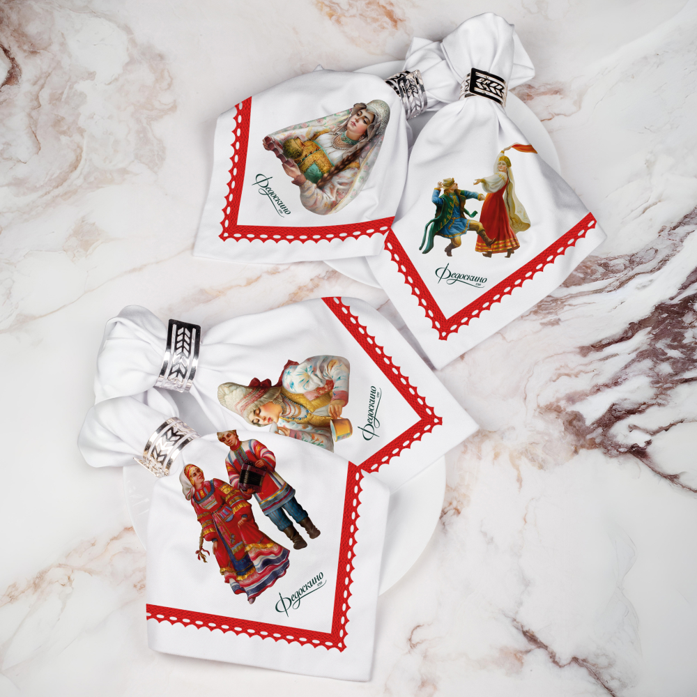 Набор салфеток столовых Повседневная Русь "Федоскино" — это эксклюзивный предмет сервировки, рожденный в союзе премиального бренда текстиля BELLEHOME и многовекового искусства лаковой миниатюры Федоскино. Эти салфетки превращают повседневную трапезу или праздничный ужин в эстетическое событие, где каждая деталь говорит об изысканном вкусе. Четыре салфетки из набора представляют собой живописные зарисовки из народной жизни, исполненные с музейной точностью и теплотой. На вашем столе оживают сцены, наполненные движением, эмоциями и ярким колоритом национальных традиций. Эти салфетки превратят любую трапезу в эстетическое событие, полное тайн и красоты народного эпоса. Рисунки отпечатаны с использованием высококачественной цифровой печати на 100% хлопковом столовом текстиле. Рекомендуемый уход: бережная стирка при температуре 40°C, без использования отбеливателей и пятновыводителей, гладить в деликатном режиме с изнаночной стороны.