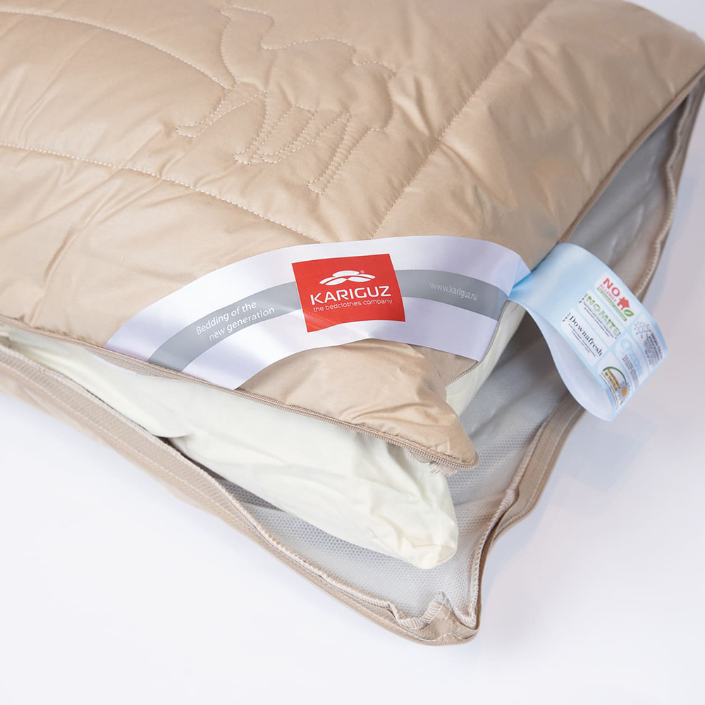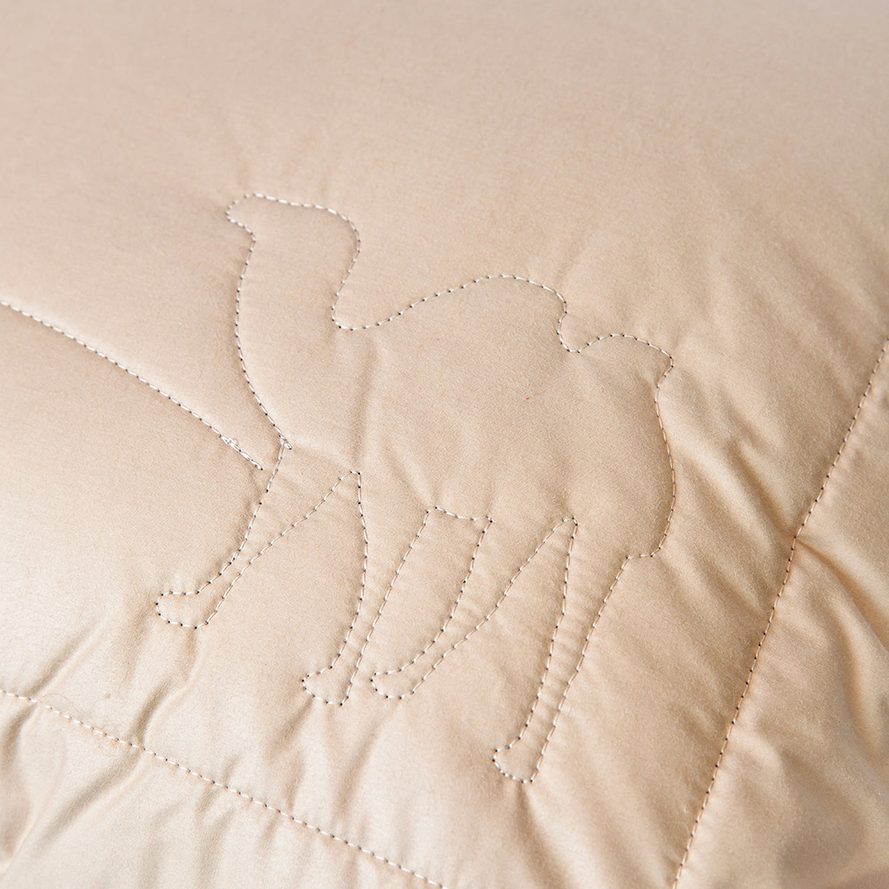 Внутри стеганного чехла на молнии находится подушка-ядро из смеси пуха и пера. Такая структура обеспечивает дополнительную поддержку и дольше сохраняет первоначальную форму изделия. Верхний съемный чехол простеган с верблюжьей шерстью. Необычная полая структура волокон из подшерстка африканского верблюжонка обеспечивает дополнительную теплоизоляцию и легкость изделия.