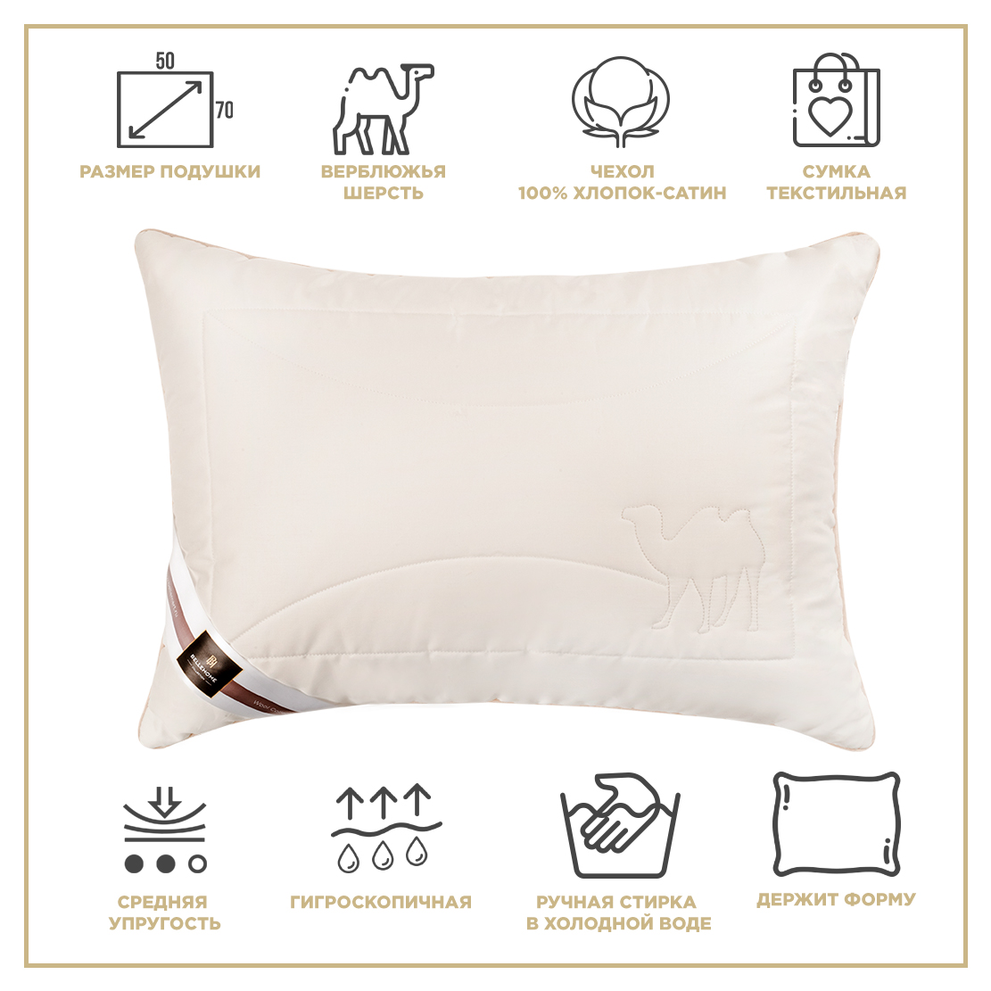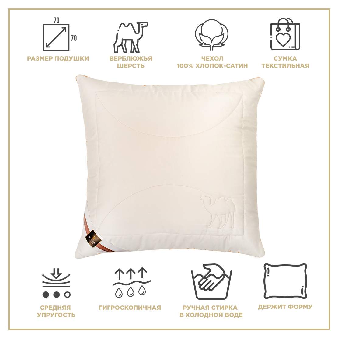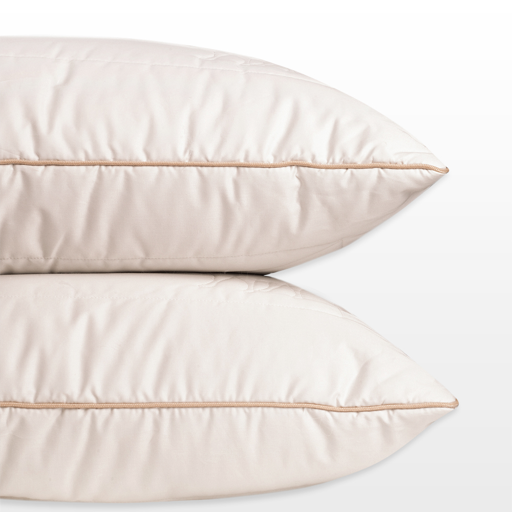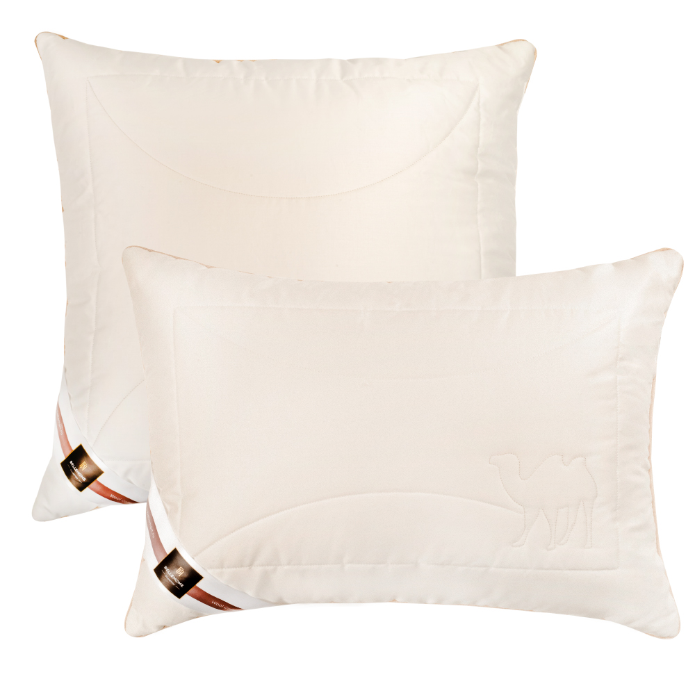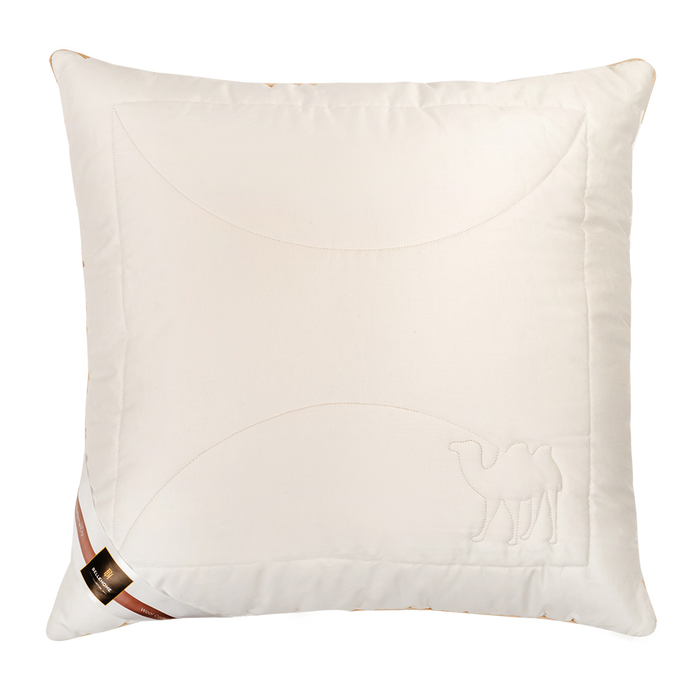 Внутри стеганного чехла на молнии находится подушка-ядро из полиэфирного силиконизированного волокна. Такая структура обеспечивает дополнительную поддержку и дольше сохраняет первоначальную форму изделия. Верхний съемный чехол простеган с верблюжьей шерстью. Необычная полая структура волокон из подшерстка африканского верблюжонка обеспечивает дополнительную теплоизоляцию и легкость изделия.