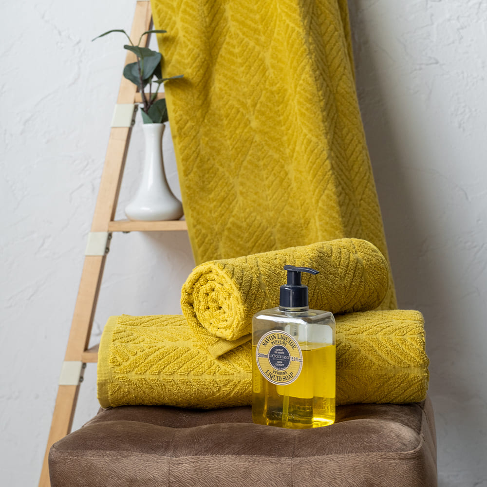 Махровое полотенце изготовлено из 100% нежнейшего хлопка и станет приятным завершением водных процедур. Натуральный состав отлично впитывает влагу, а плотный и густой слой махровых петель 520 гр/м² делает полотенце приятными на ощупь для лица и тела. Выполнено в приятном янтарном цвете из жаккардового полотна, а благодаря высокому качеству наше банное полотенце сохранит цвет и форму даже после многочисленных стирок.