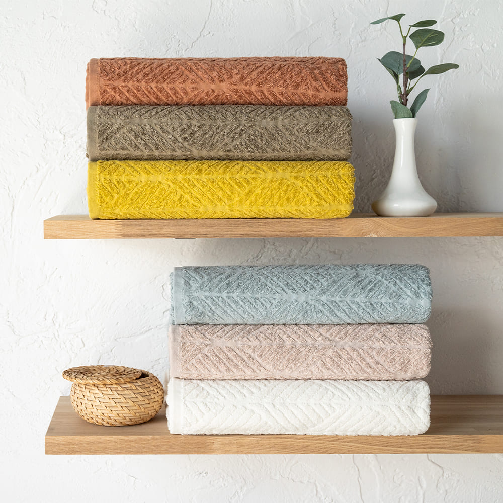 Махровое полотенце изготовлено из 100% нежнейшего хлопка и станет приятным завершением водных процедур. Натуральный состав отлично впитывает влагу, а плотный и густой слой махровых петель 520 гр/м² делает полотенце приятными на ощупь для лица и тела. Выполнено в приглушенном зеленом цвете из жаккардового полотна, а благодаря высокому качеству наше банное полотенце сохранит цвет и форму даже после многочисленных стирок.