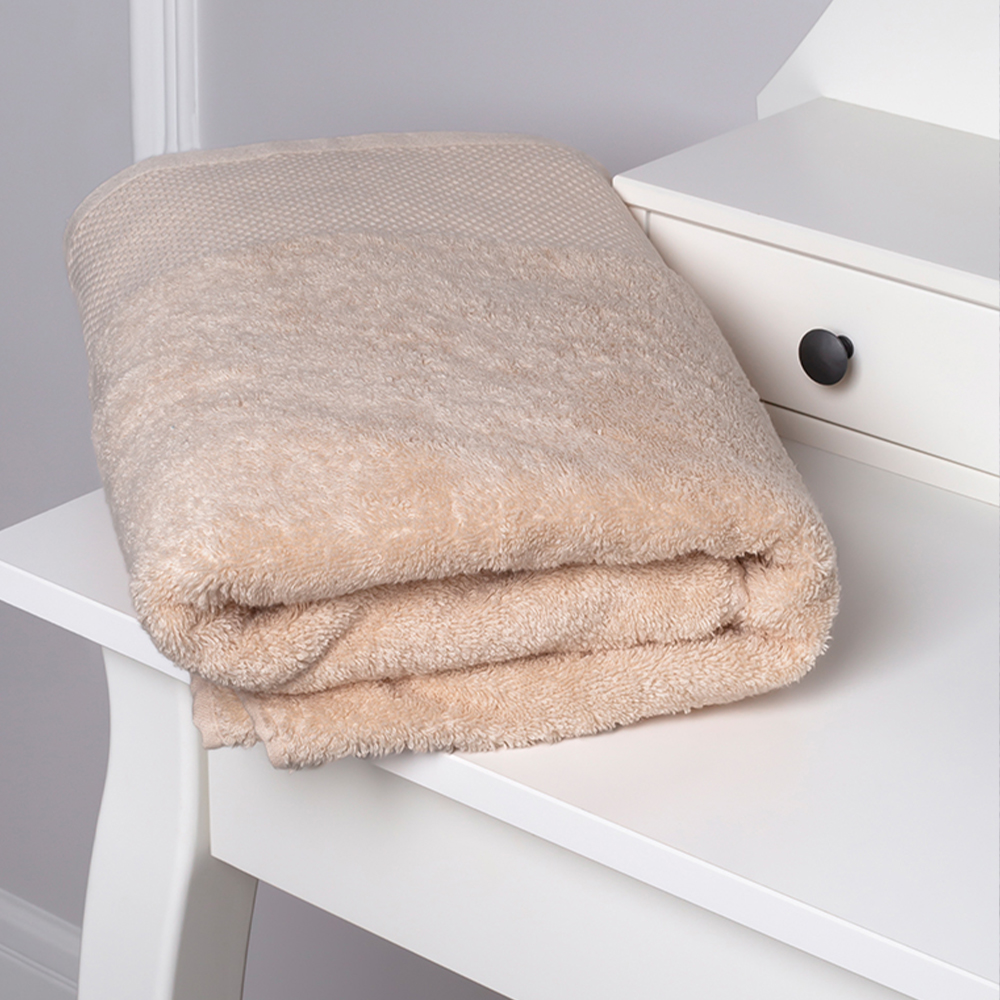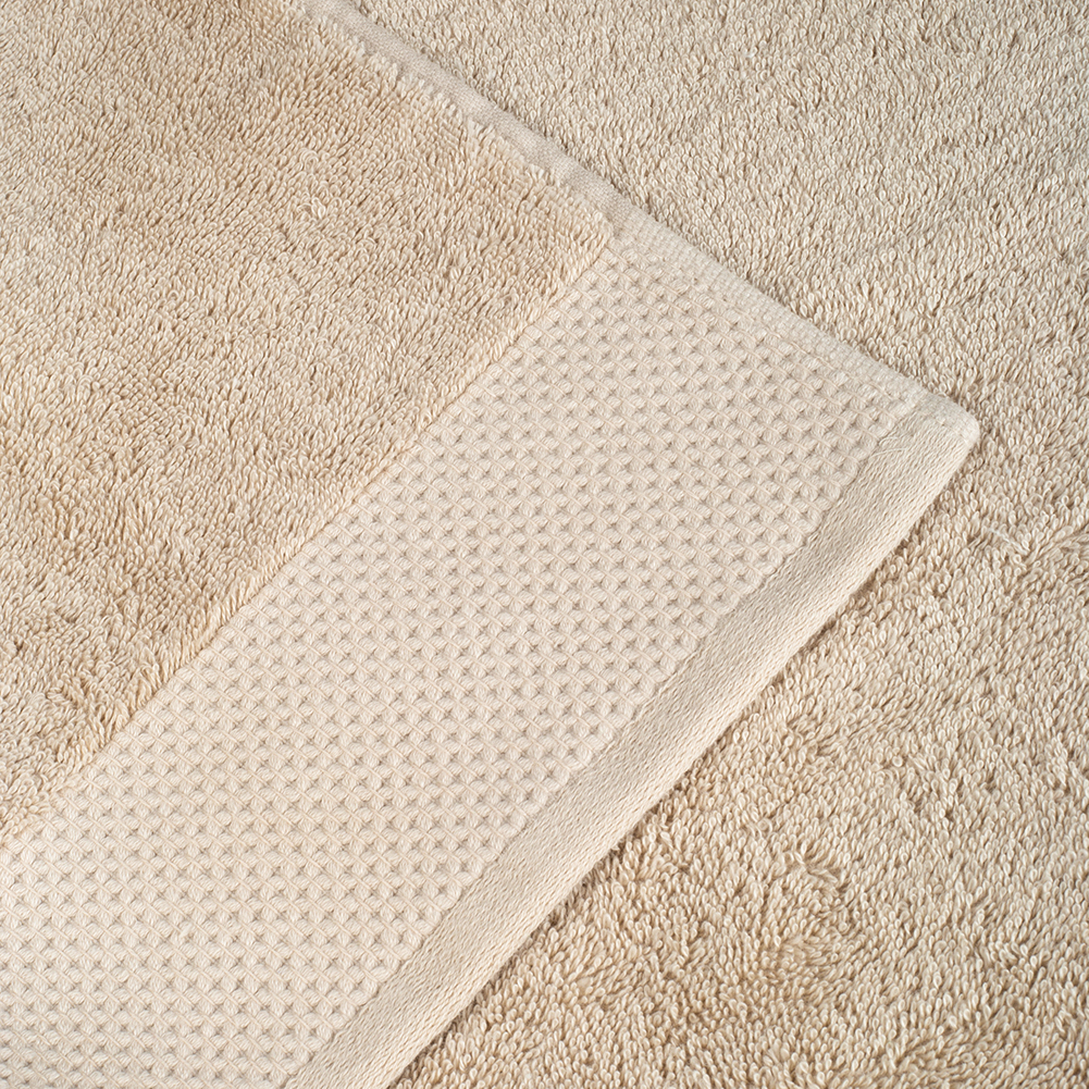 Махровое полотенце изготовлено из 100% нежнейшего хлопка и станет приятным завершением водных процедур. Натуральный состав отлично впитывает влагу, а густой слой махровых петель 500 гр/м² делает полотенце приятным на ощупь для лица и тела. Выполнено в бежевом цвете с лаконичным декором в виде тисненого бордюра, а благодаря высокому качеству наше банное полотенце сохранит цвет и форму даже после многочисленных стирок.