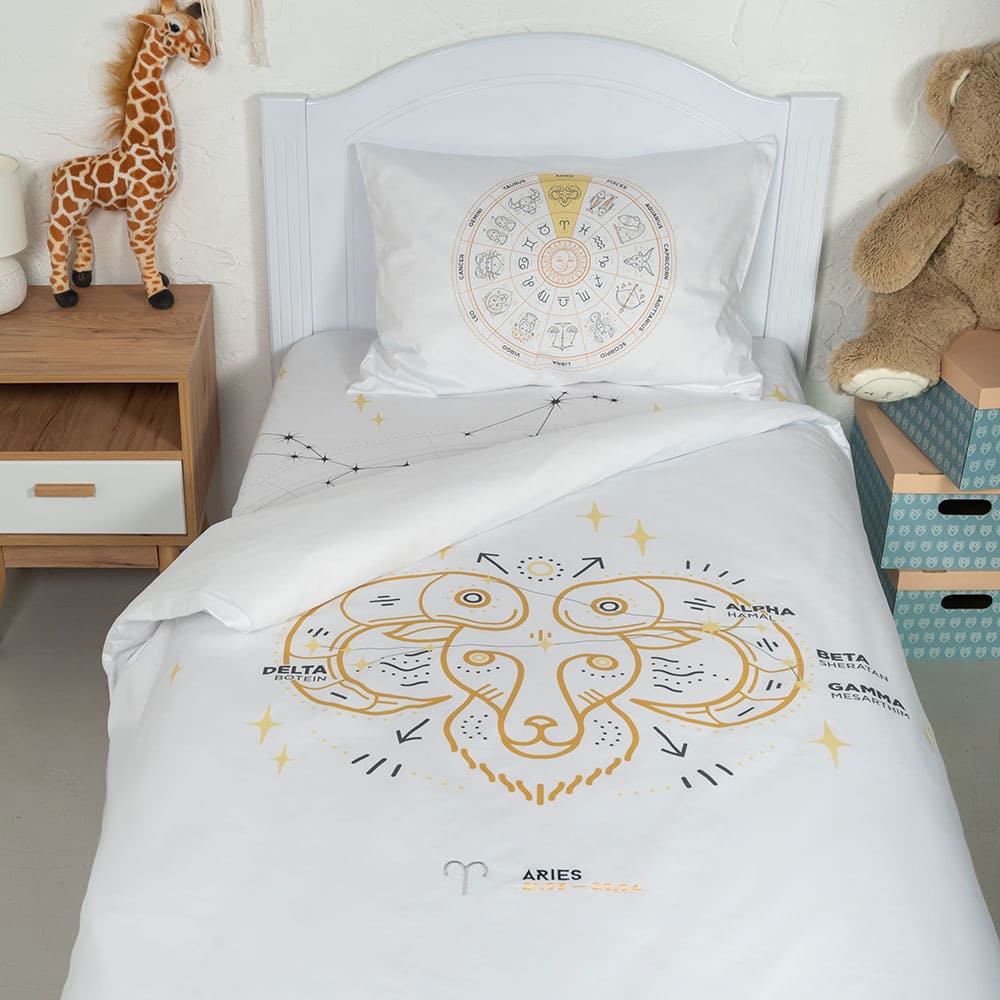Комплект постельного белья детский изготовлен из 100% длинноволокнистого хлопка с сатиновым переплетением 200 ТС, что обеспечивает приятную мягкость, гладкость и шелковистый блеск. Натуральные волокна не вызывают раздражения, а высокая плотность ткани позволяет коже дышать, обеспечивая здоровый и крепкий сон вашего ребенка. Специальная обработка сохраняет яркие цвета и предотвращает появление катышков, а предварительная усадка обеспечивает долговечность. Данный комплект украшен знаком зодиака Овен.