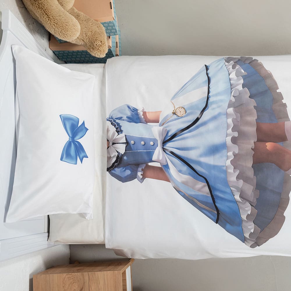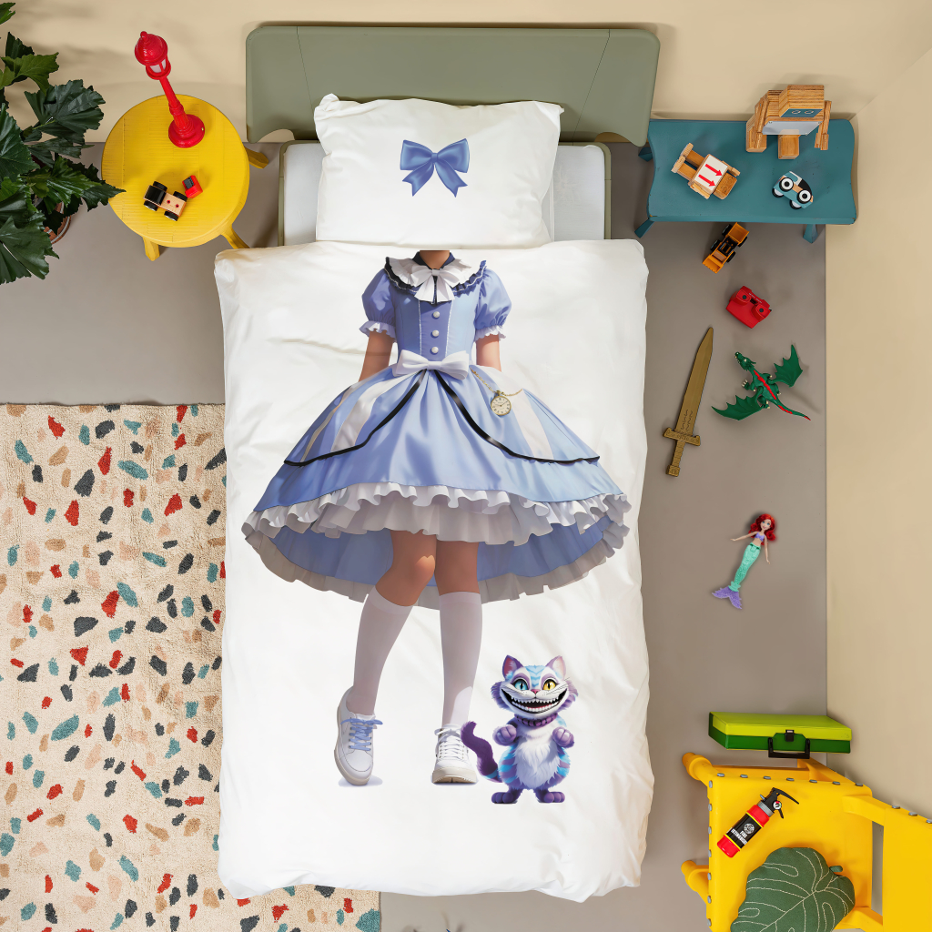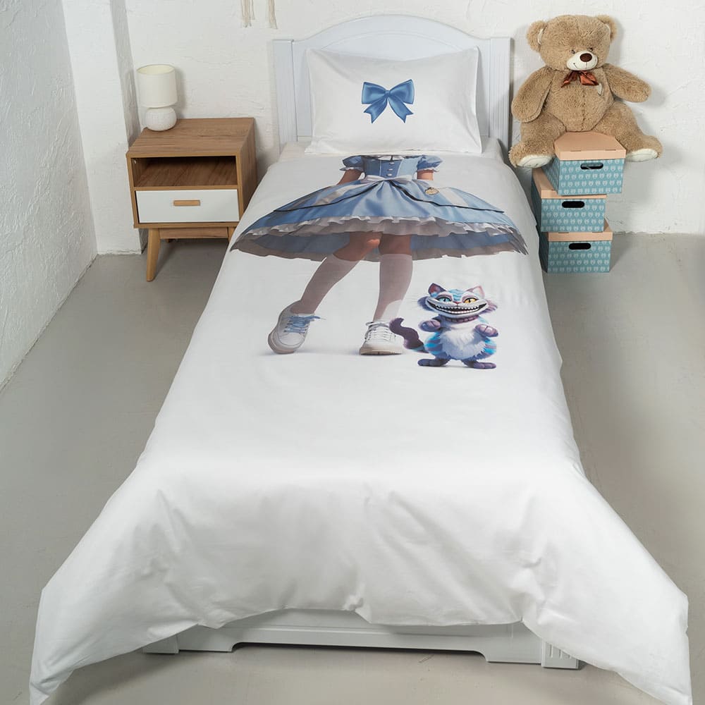 Ткань изготовлена из 100% длинноволокнистого хлопка, сатинового переплетения высокой плотности 200ТC. Комплект постельного белья по тактильным ощущениям мягкий и гладкий, с шелковистым блеском. Натуральные волокна не вызывают раздражения кожи, ткань отлично пропускает воздух. Постельное белье "Мама, я Алиса" выполнено в классическом белом цвете. На лицевой стороне наволочки и пододеяльника изображена Алиса из Страны чудес.