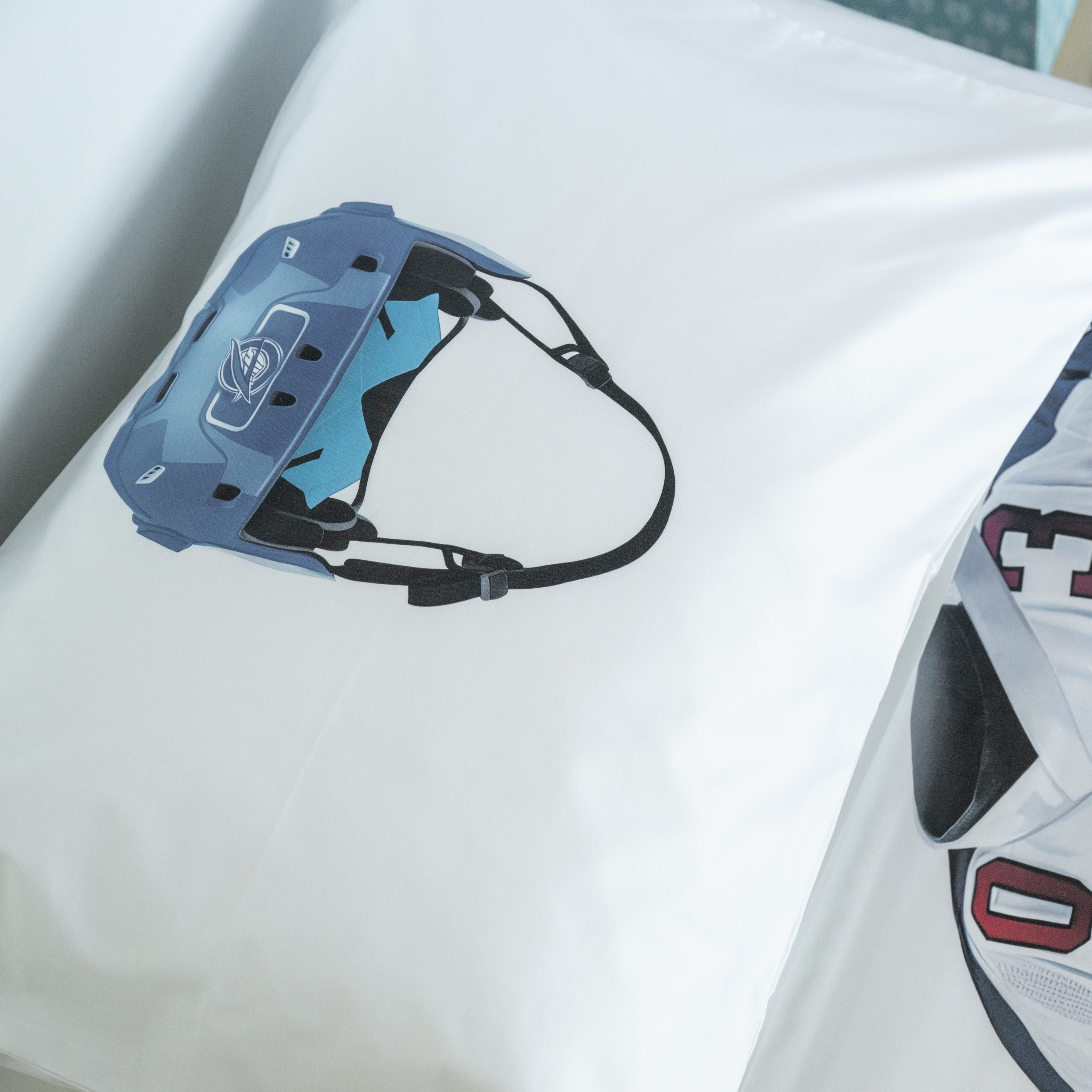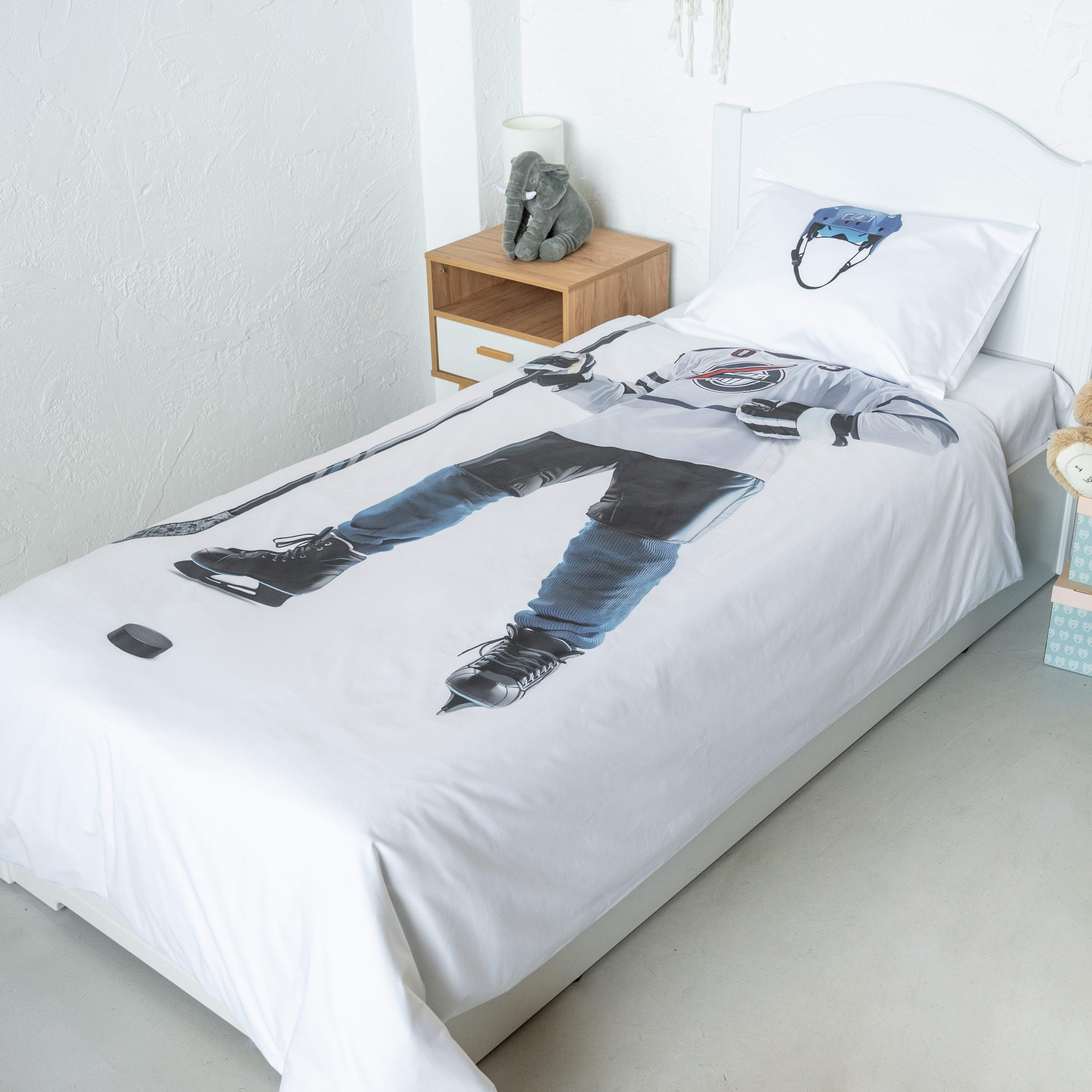 Ткань изготовлена из 100% длинноволокнистого хлопка, сатинового переплетения высокой плотности 200ТC. Комплект постельного белья по тактильным ощущениям мягкий и гладкий, с шелковистым блеском. Натуральные волокна не вызывают раздражения кожи, ткань отлично пропускает воздух. Постельное белье "Мама, я Хоккеист" выполнено в классическом белом цвете. На лицевой стороне наволочки и пододеяльника изображен уверенный хоккеист.
