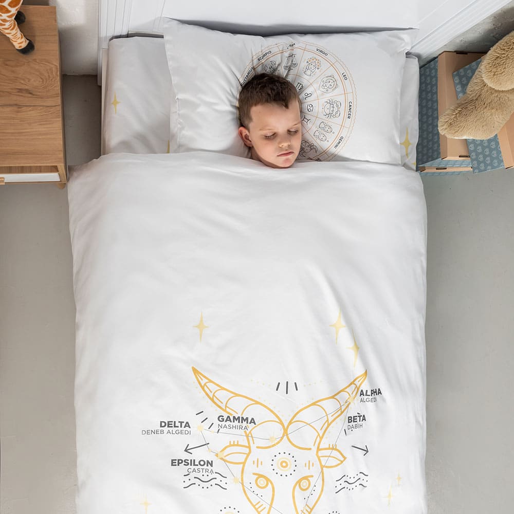 Комплект постельного белья детский изготовлен из 100% длинноволокнистого хлопка с сатиновым переплетением 200 ТС, что обеспечивает приятную мягкость, гладкость и шелковистый блеск. Натуральные волокна не вызывают раздражения, а высокая плотность ткани позволяет коже дышать, обеспечивая здоровый и крепкий сон вашего ребенка. Специальная обработка сохраняет яркие цвета и предотвращает появление катышков, а предварительная усадка обеспечивает долговечность. Данный комплект украшен знаком зодиака Козерог.