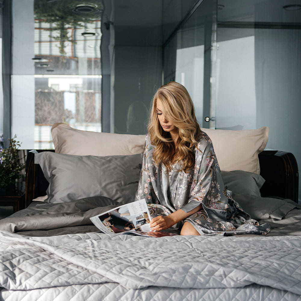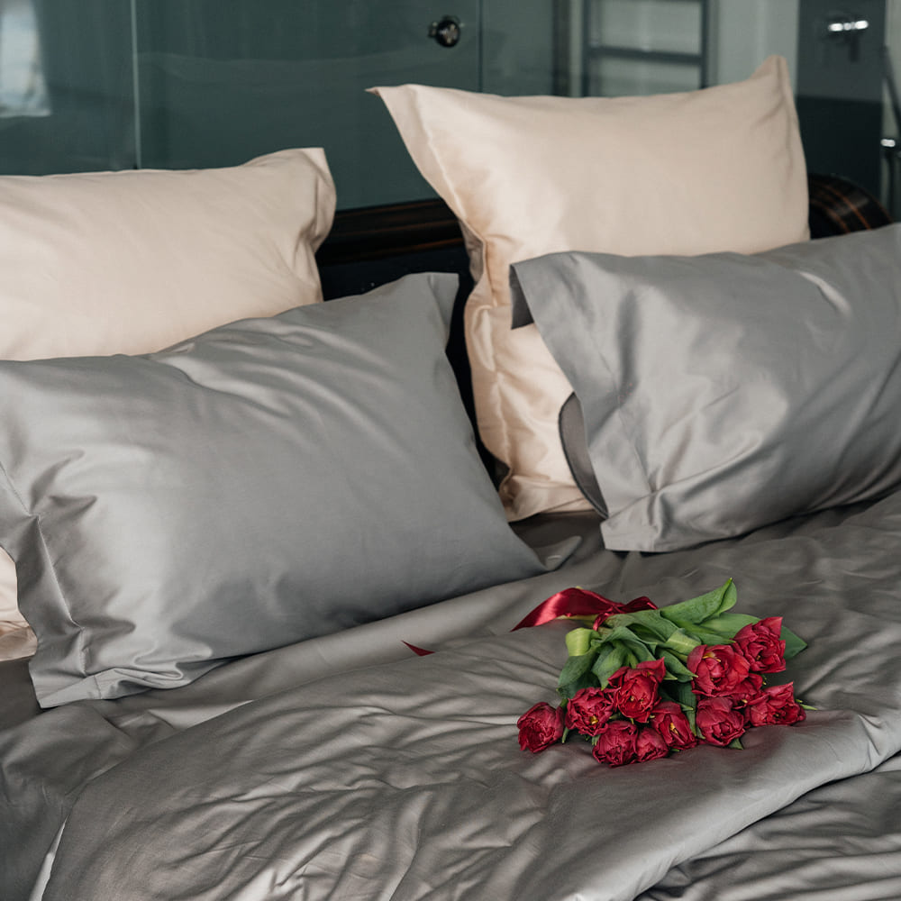 Комплект выполнен из ткани премиального качества 100% натурального длинноволокнистого хлопка-сатина плотностью 300ТС. Натуральная ткань отлично пропускает воздух, а необыкновенная мягкость сатина достигается за счет специальной обработки ткани - мерсеризации, после которой ее лицевая сторона приобретает нежную бархатистую структуру. Система антипиллинга предотвращает появление катышков, а предварительная усадка ткани защищает комплект от деформации.