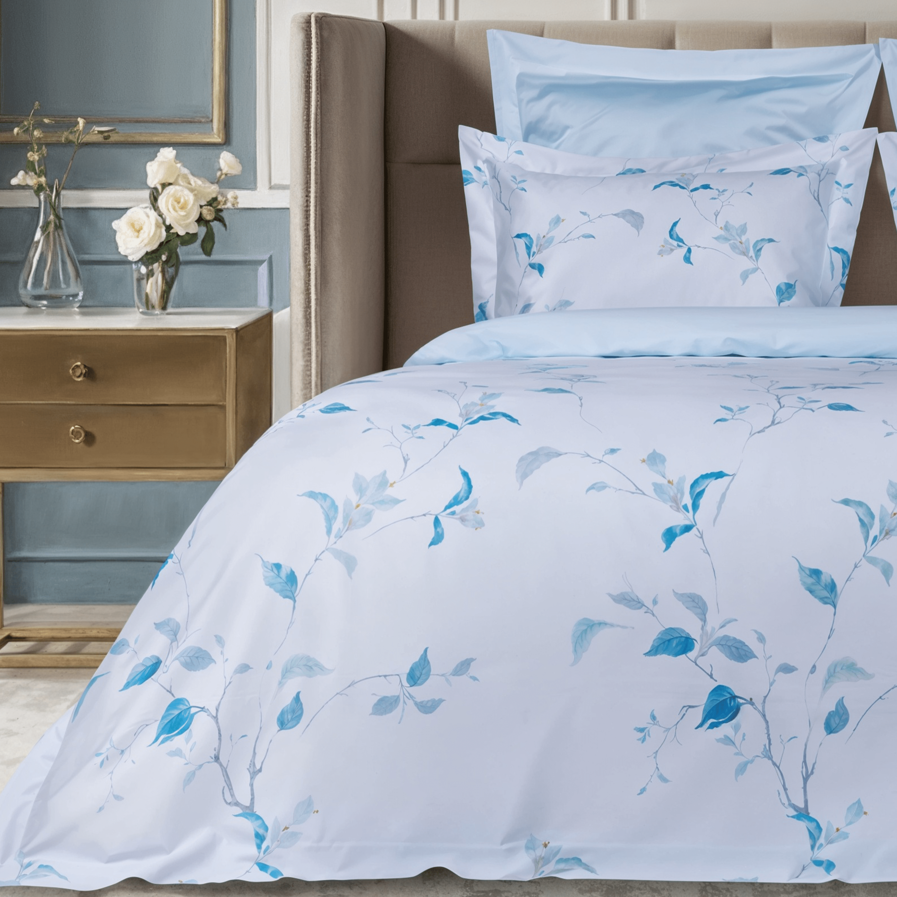 Дизайн комплекта вдохновлен природной свежестью и лёгкостью. Белоснежное полотно украшено акварельными растительными узорами в сине-зелёной гамме. Изящные цветочные мотивы создают атмосферу спокойствия и гармонии. Этот комплект станет прекрасным акцентом в интерьере спальни, придавая ей уют и утонченность.