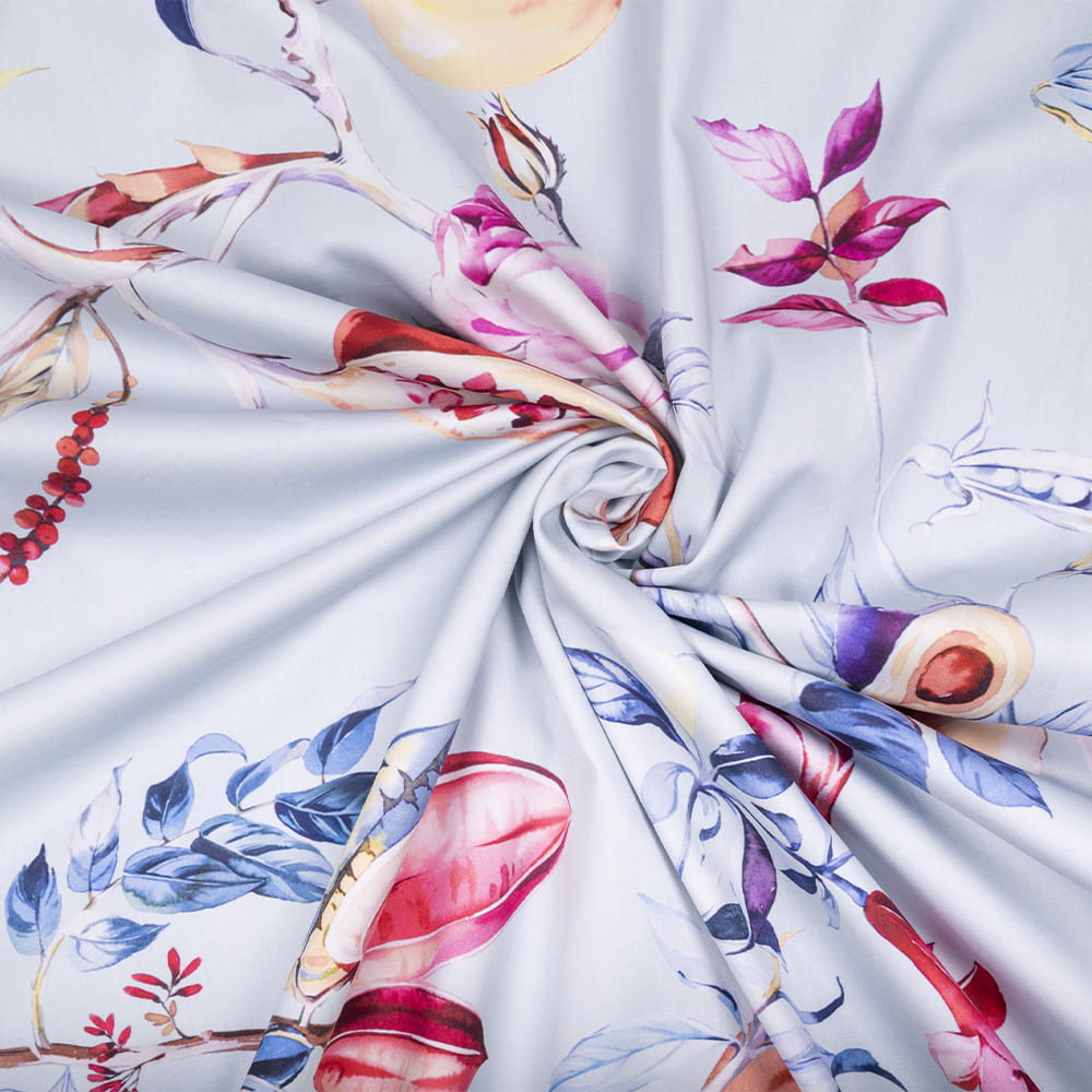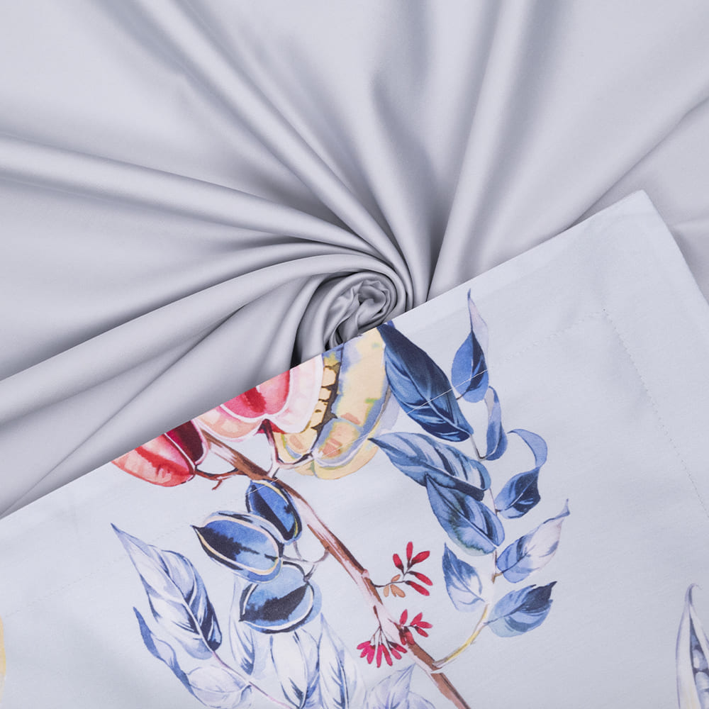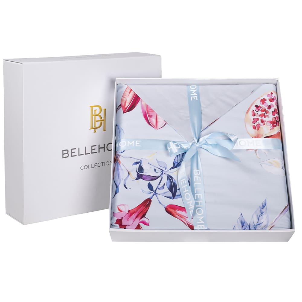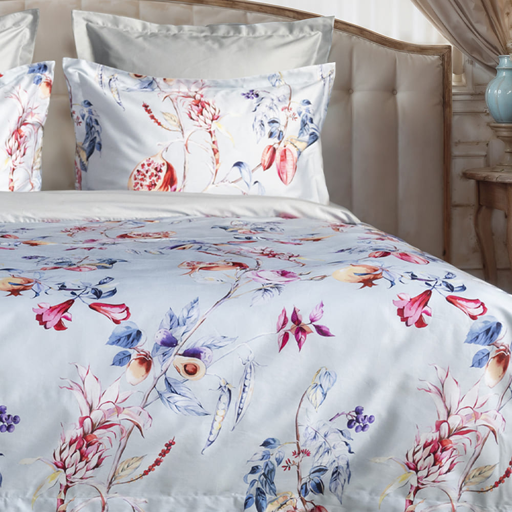 Постельное белье в нежно-голубом цвете украшает воздушная лоза с контрастными цветами и плодами сочного граната, тыльная сторона спокойного серого цвета.
