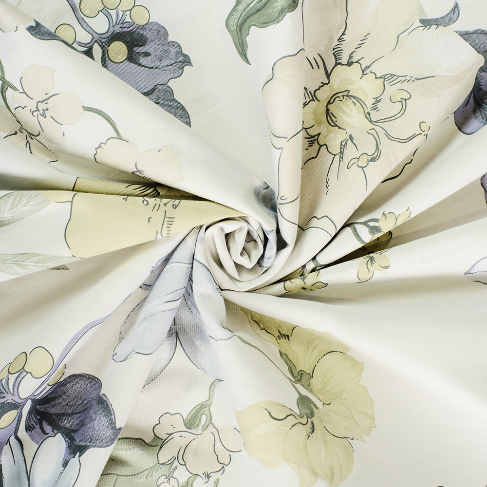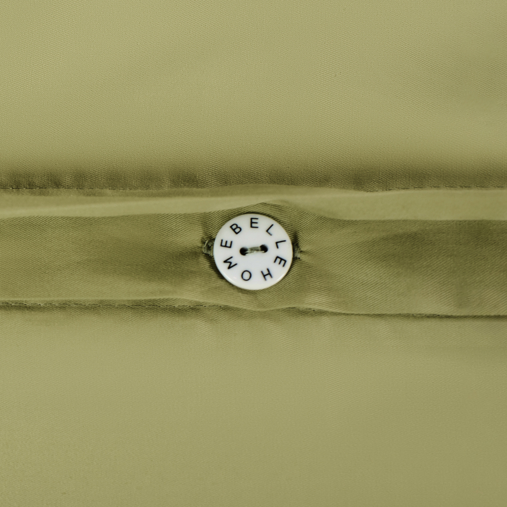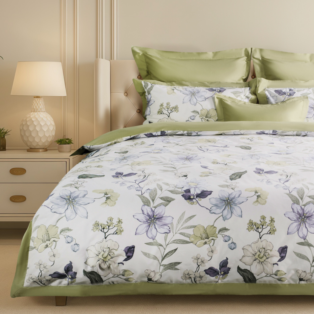 Дизайн комплекта создают ткани-компаньоны двух цветов: лицевая сторона украшена изысканным растительным принтом с изображением цветов и листьев в оттенках синего, зелёного и жёлтого., а тыльная выполнена в нежном оливковом цвете. Такой комплект станет прекрасным дополнением к интерьеру спальни, создавая атмосферу уюта и элегантности.