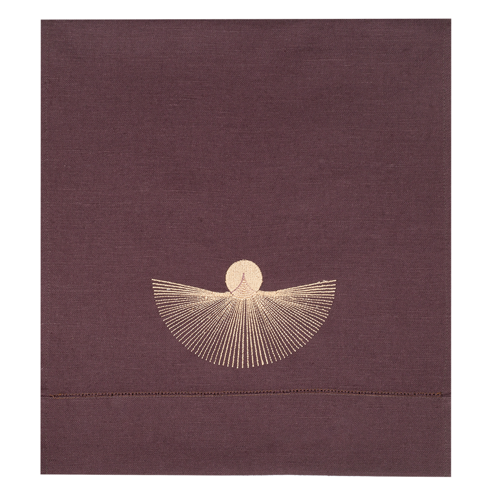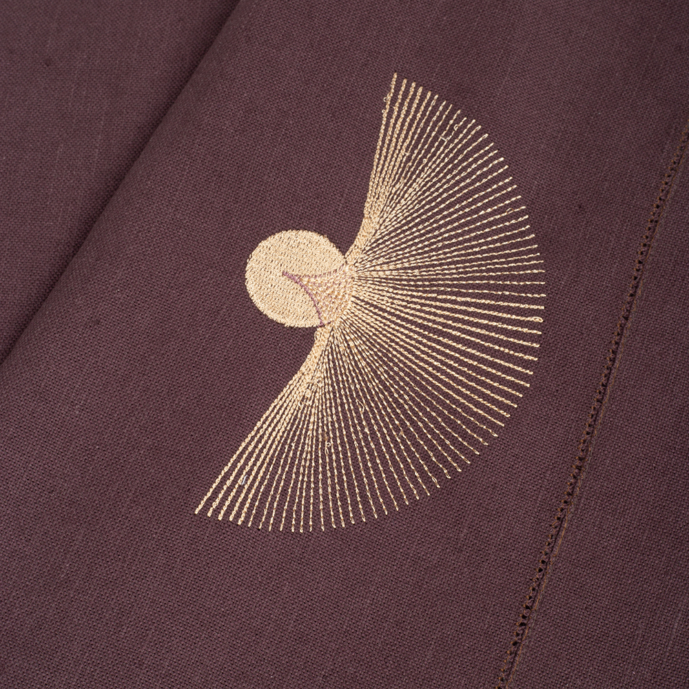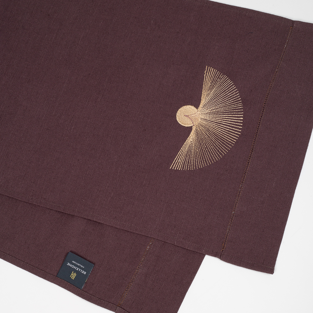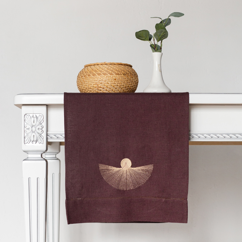 Дорожка столовая из серии Black mistery, имеет классическую прямоугольную форму, по бордюру украшена лаконичной мережкой, и оригинальной дизайнерской вышивкой в виде мистического солнца.