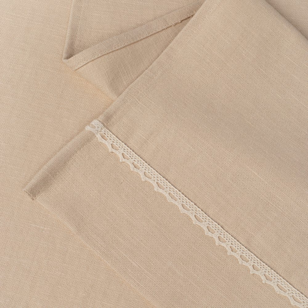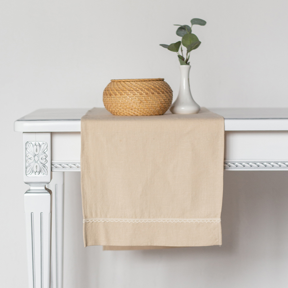 Дорожка столовая Laces Sand от BELLEHOME — красивый и практичный элемент кухонного текстиля. Натуральная текстура переплетения нитей и эффектом естественной мятости полотна станет практичным дополнением для вашей кухни. Ткань из органического льна с добавлением хлопка высшего сорта прошла специальную обработку, после которой стала мягкой и приятной на ощупь. Натуральный лен прост в уходе, легко отстирывается, после стирки скатерть не сядет и сохранит исходный размер и форму, а благодаря добавлению хлопка меньше мнется.