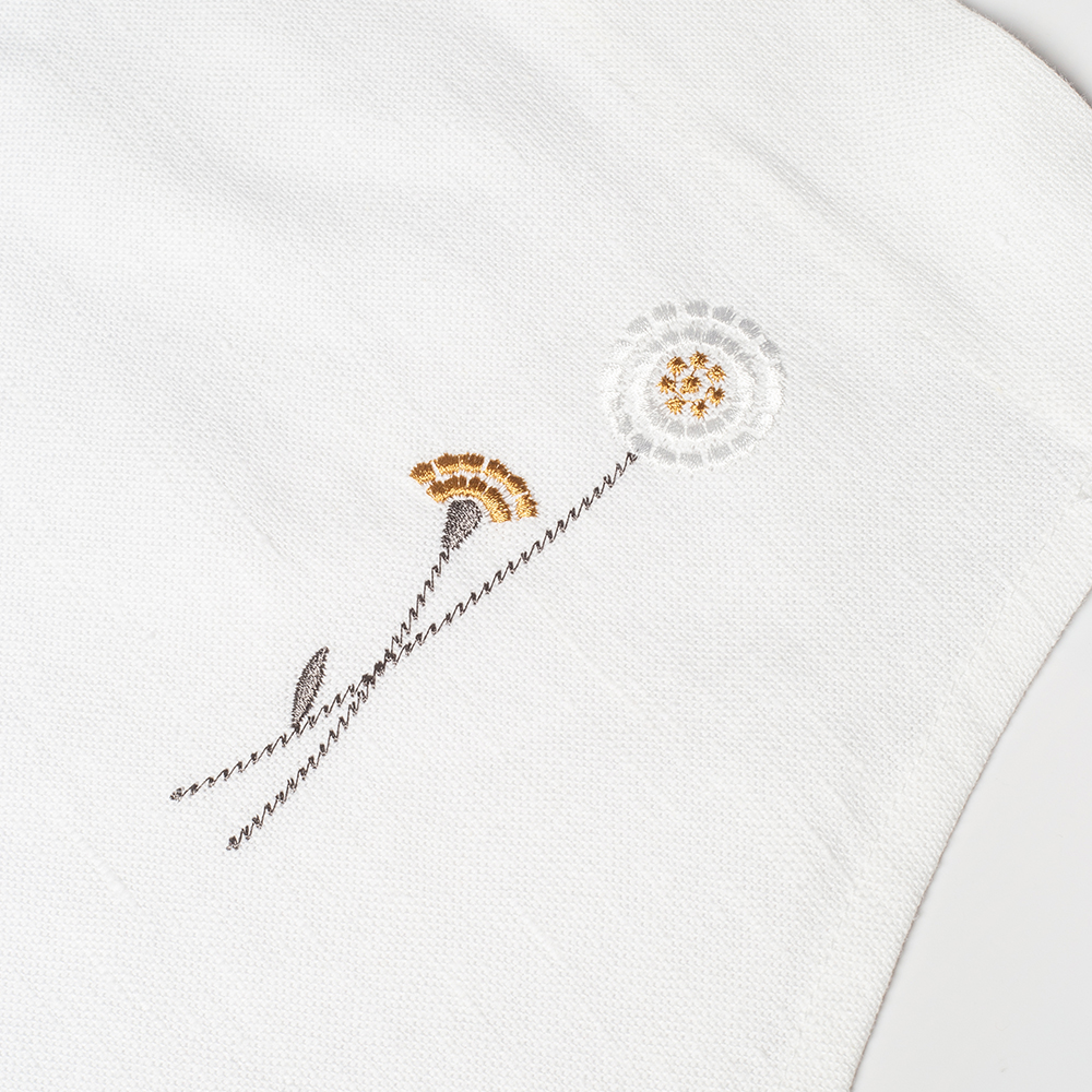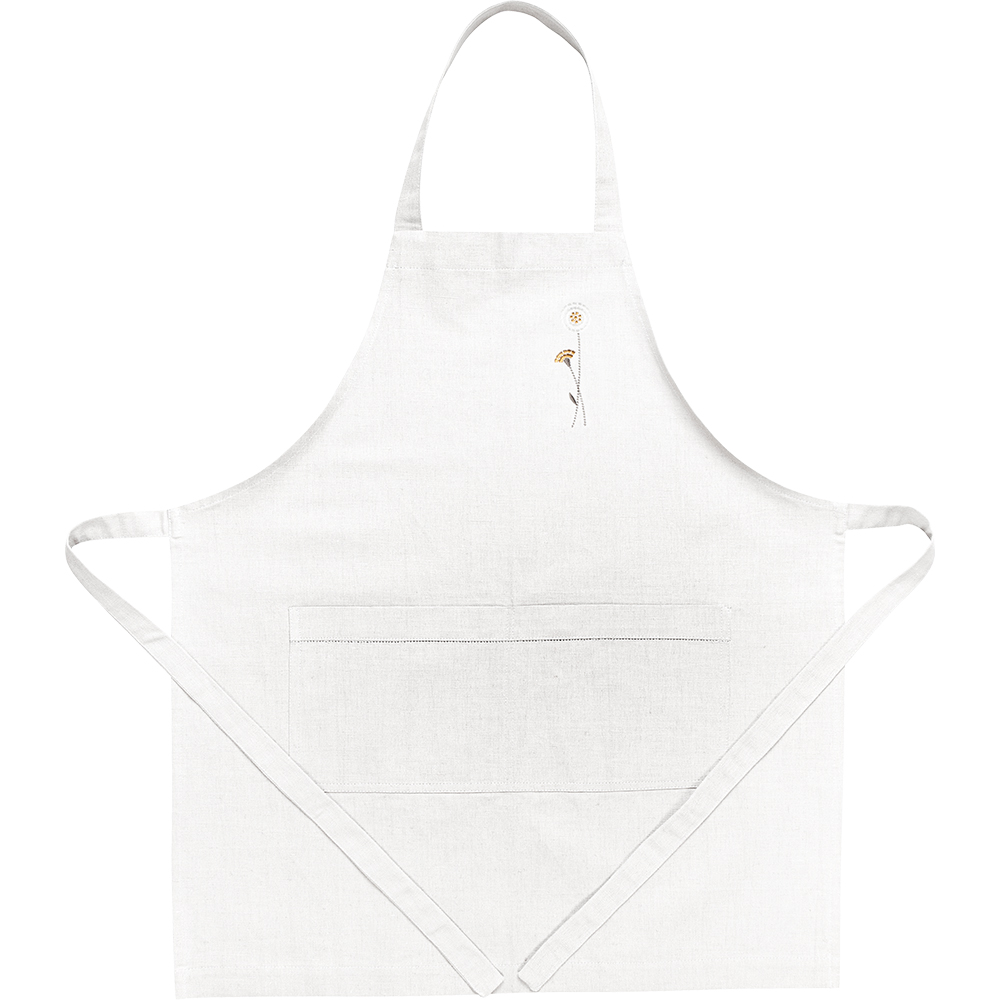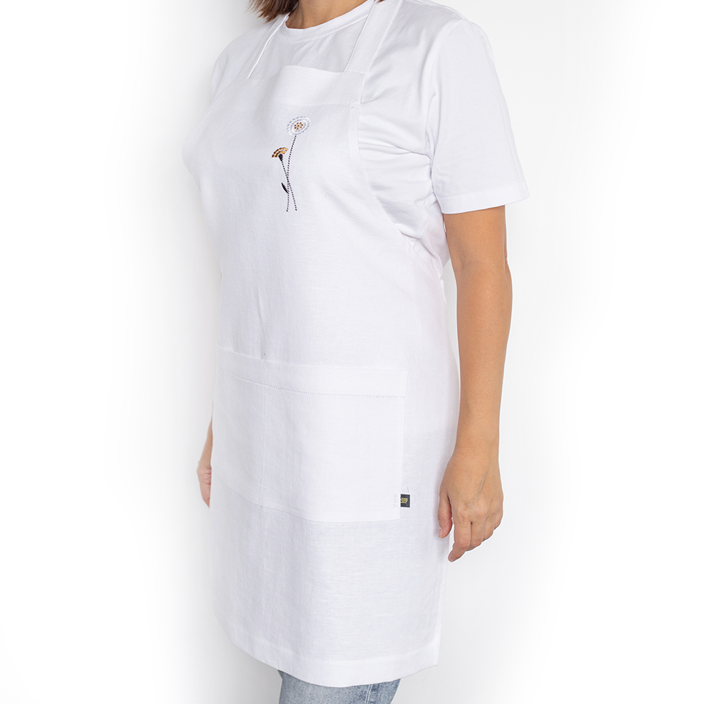 Фартук из серии Meadow romance, представлен в универсальном размере 42-60, имеет классическую прямоугольную форму и удобные широкие карманы, украшенные лаконичной мережкой, и оригинальной дизайнерской вышивкой в виде лаконичных полевых цветов.