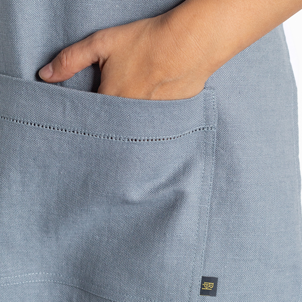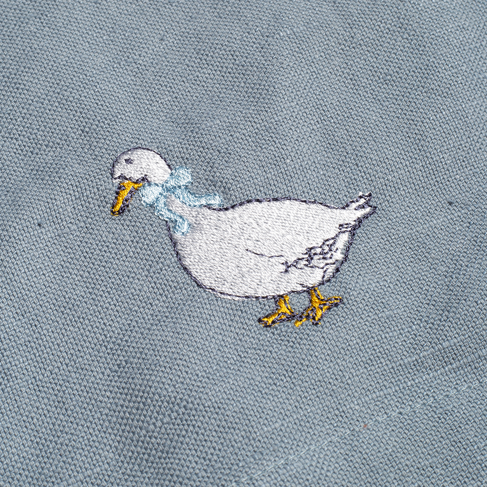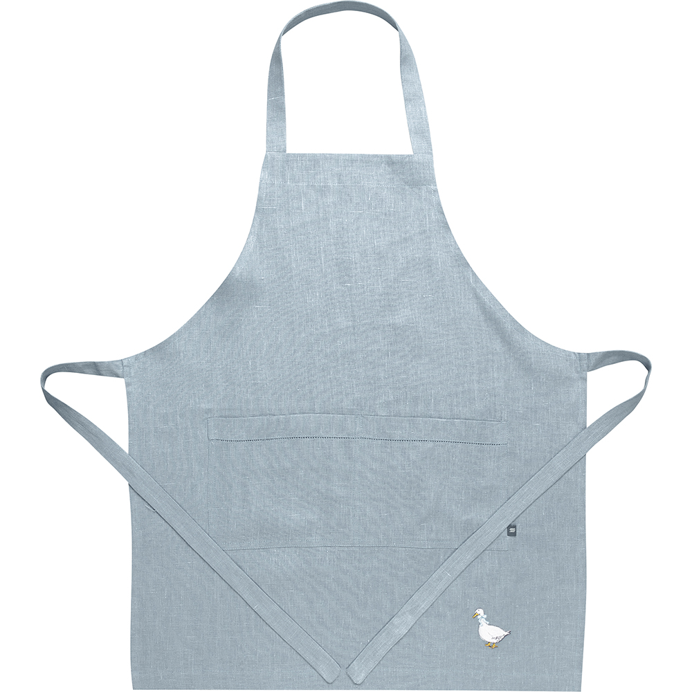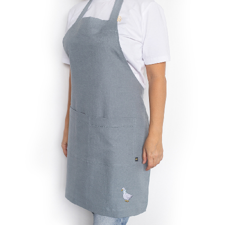 Фартук из серии Goose bernadotte, представлен в универсальном размере 42-60, имеет классическую прямоугольную форму и удобные широкие карманы, украшенные лаконичной мережкой, оригинальная дизайнерская вышивка в виде симпатичного гуся расположена в углу фартука.