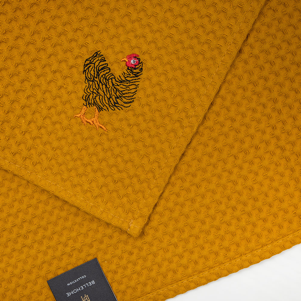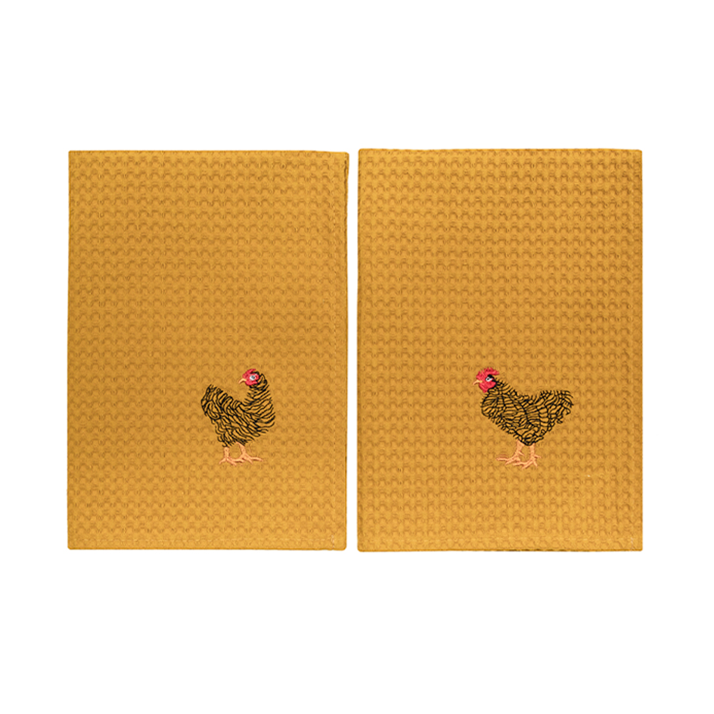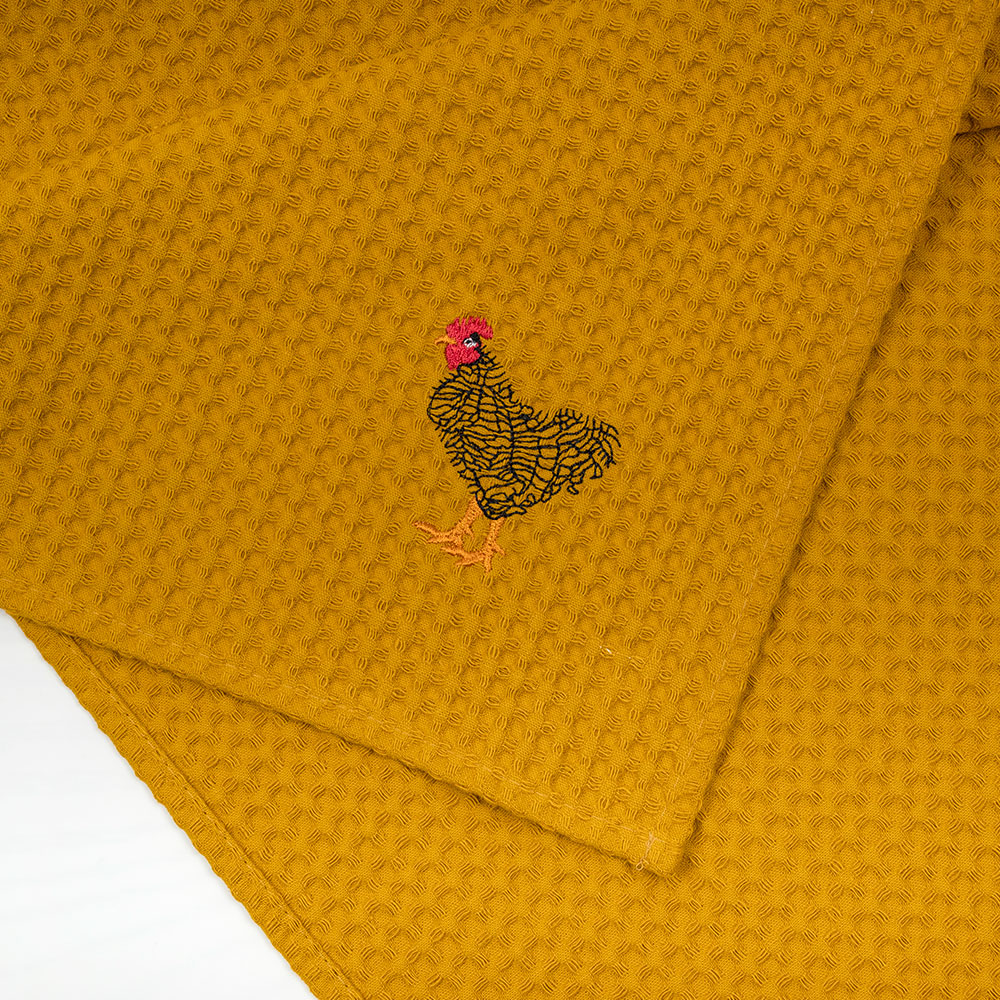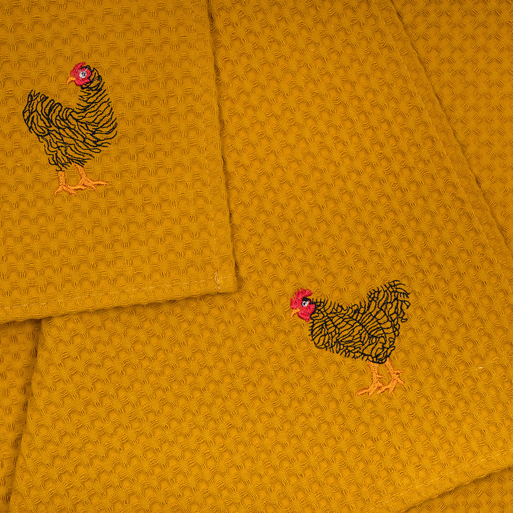 Вафельные полотенца для кухни с вышивкой «Курочки» — красивый и практичный элемент столового текстиля. Объемная фактура в виде квадратных ячеек позволяет ткани легко и быстро впитывать влагу. Изготовлены из 100% хлопка, мягкие и приятные на ощупь. Благодаря высокой плотности, устойчивы к изнашиванию и могут активно использоваться в быту.