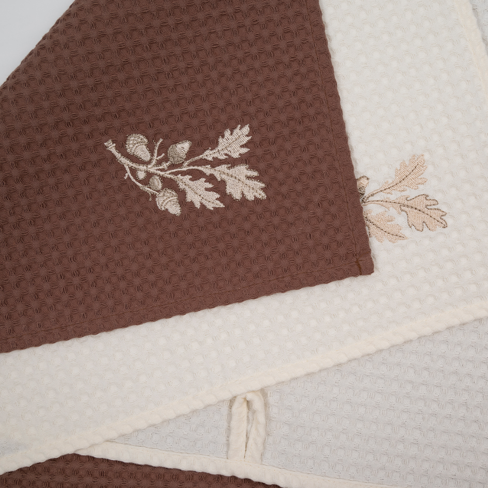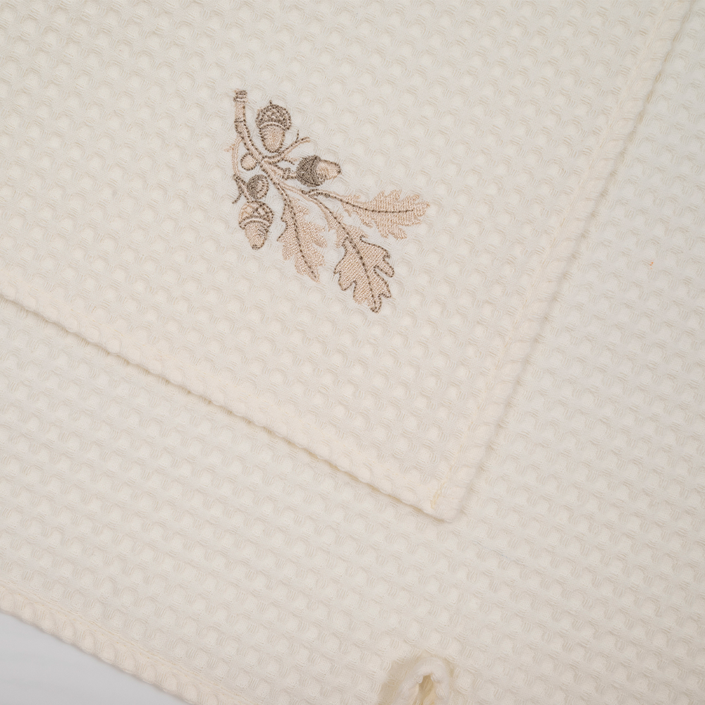 Вафельные полотенца для кухни с вышивкой «Golden Oaks» — красивый и практичный элемент столового текстиля. Объемная фактура в виде квадратных ячеек позволяет ткани легко и быстро впитывать влагу. Изготовлены из 100% хлопка, мягкие и приятные на ощупь. Благодаря высокой плотности, устойчивы к изнашиванию и могут активно использоваться в быту.