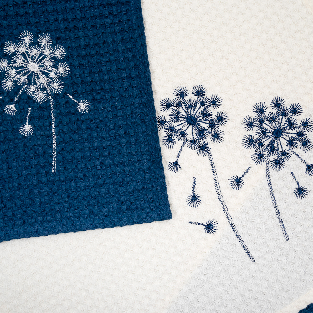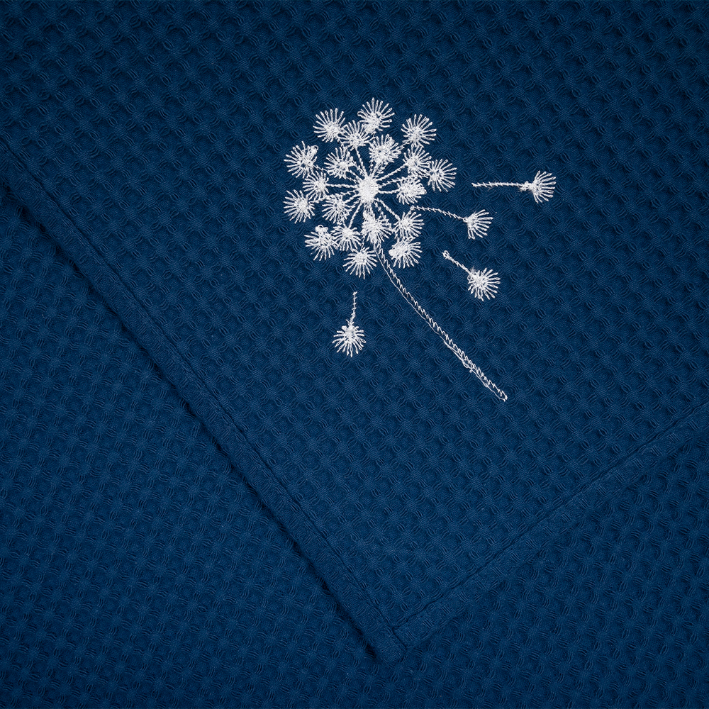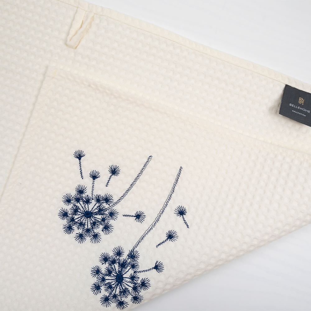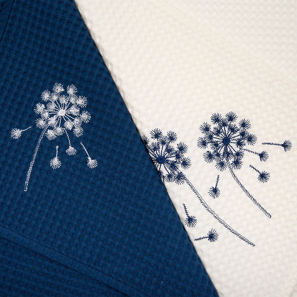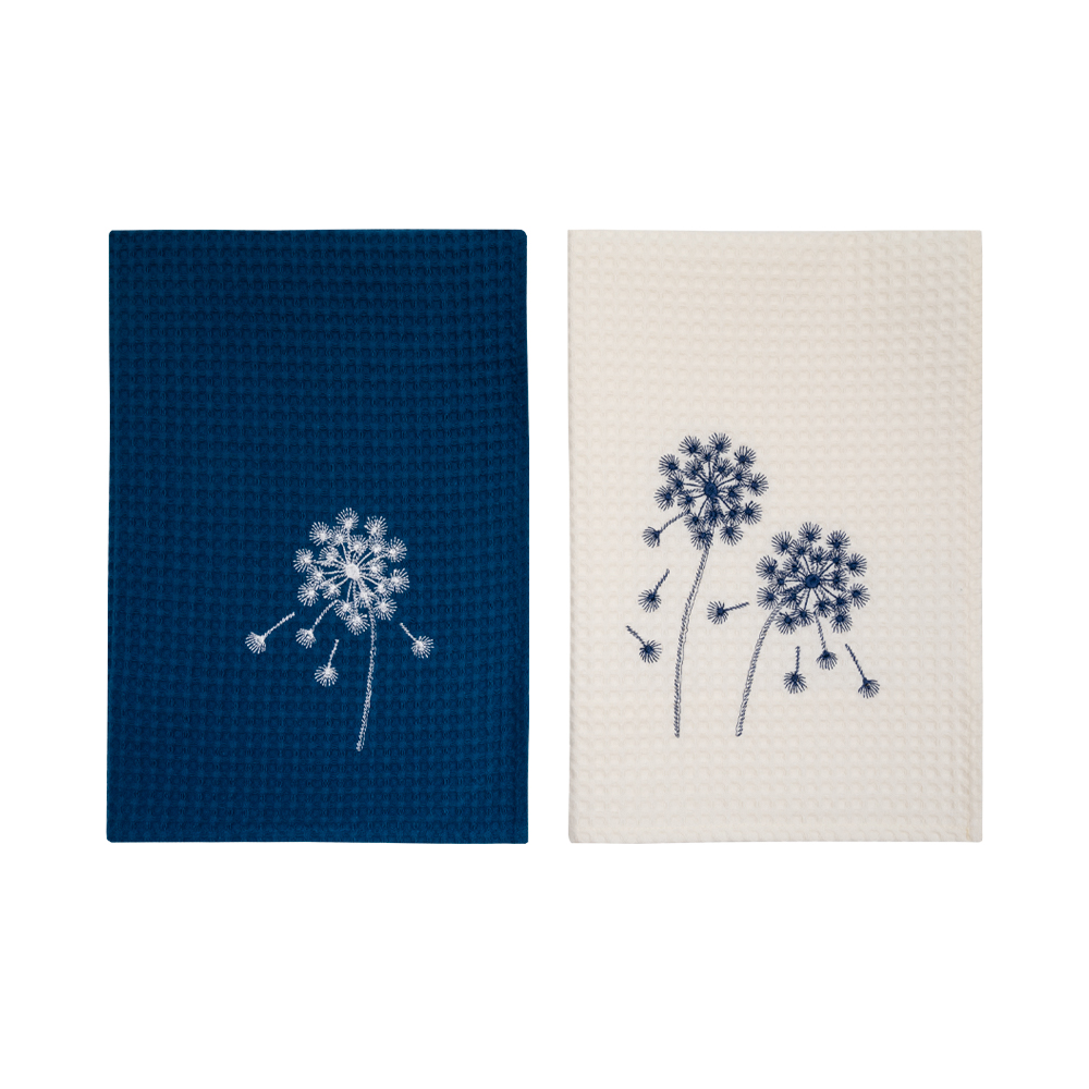 Вафельные полотенца для кухни с вышивкой «Blowball» — красивый и практичный элемент столового текстиля. Объемная фактура в виде квадратных ячеек позволяет ткани легко и быстро впитывать влагу. Изготовлены из 100% хлопка, мягкие и приятные на ощупь. Благодаря высокой плотности, устойчивы к изнашиванию и могут активно использоваться в быту.