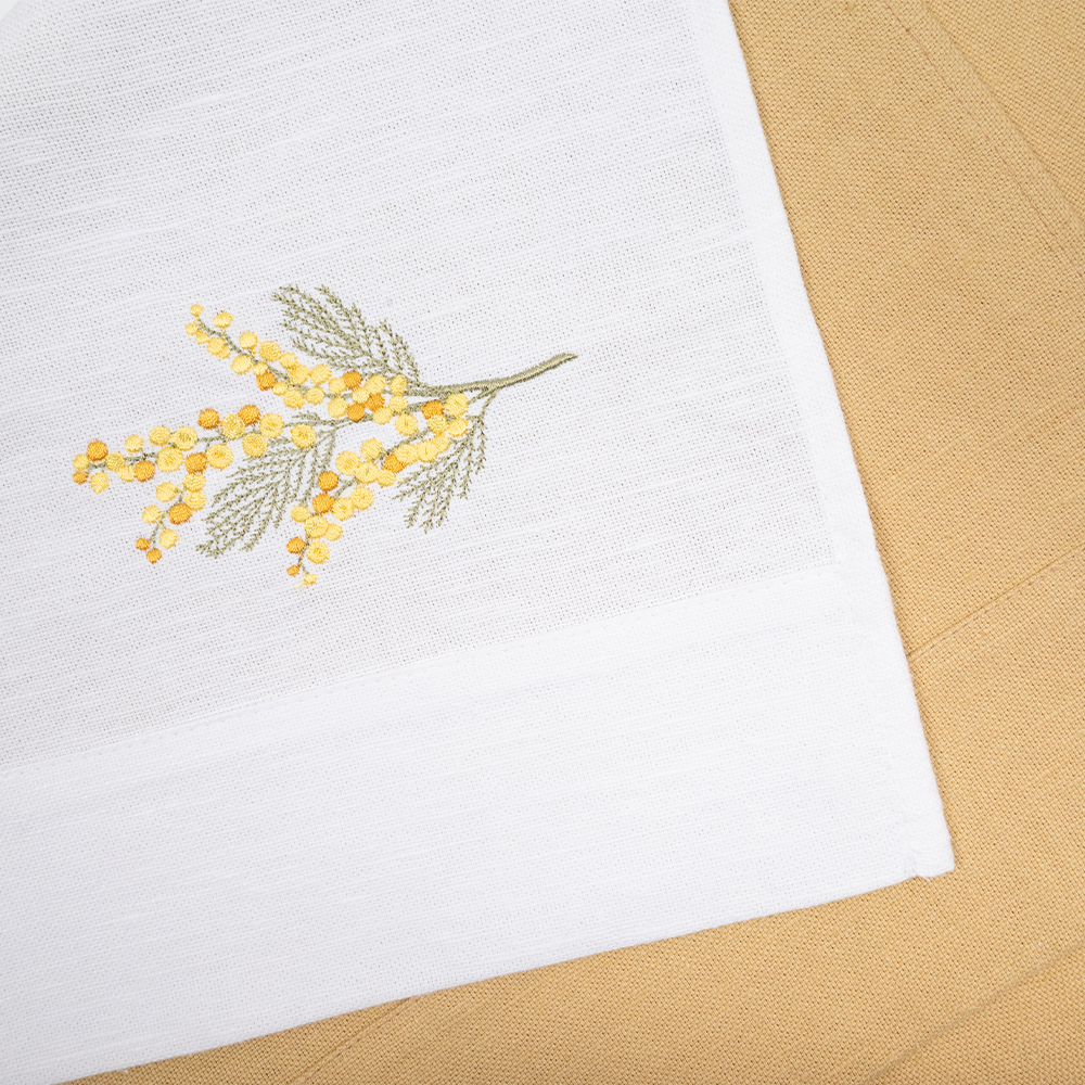 Уникальная яркая весенняя вышивка с мимозой. Стойкие красители, используемые при производстве ткани, позволяют активно использовать полотенца и сохранять их в прекрасном состоянии надолго.