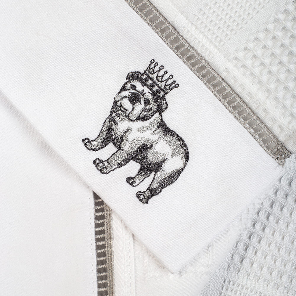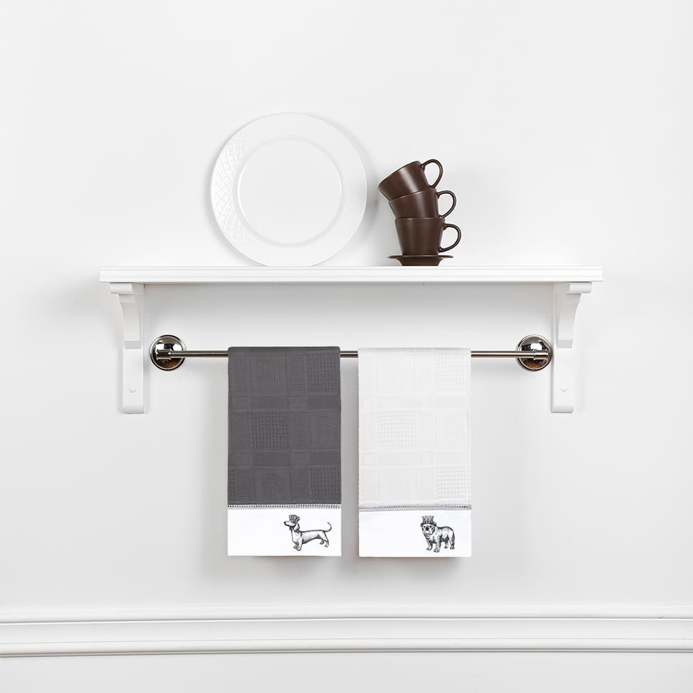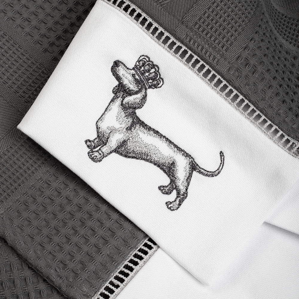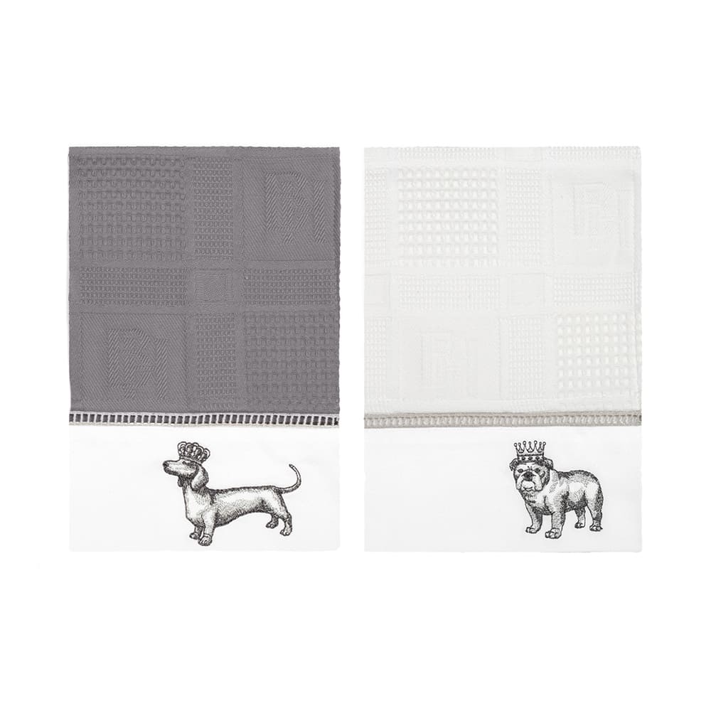 Комплект выполнен из высококачественного хлопка белого и серого цвета. Полотенца украшают вышитые изображения таксы и мопса в коронах. Дизайн полотенец гармонично дополнит интерьер. Вафельные полотенца BELLEHOME - это практичность, комфорт и уют!