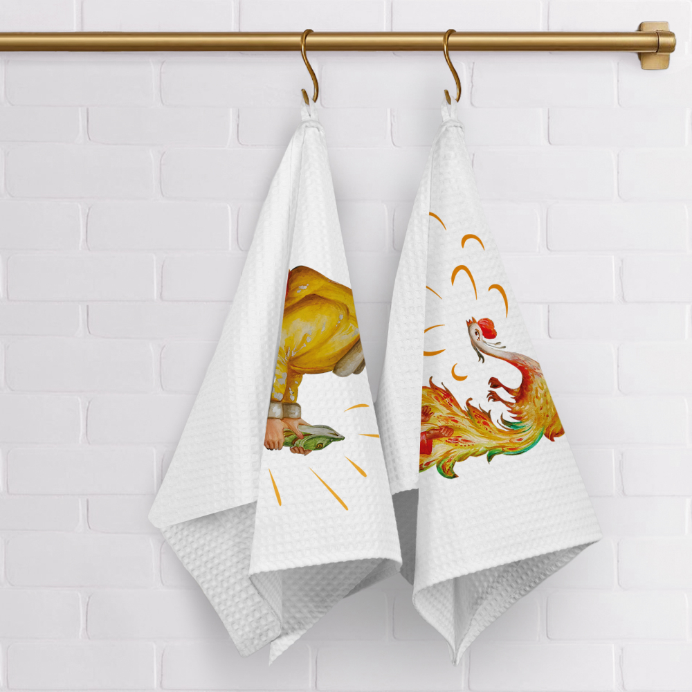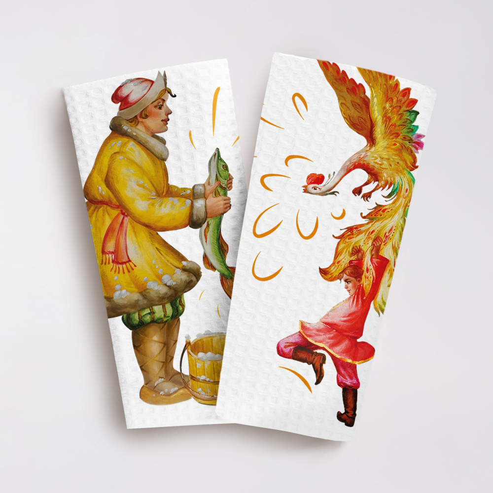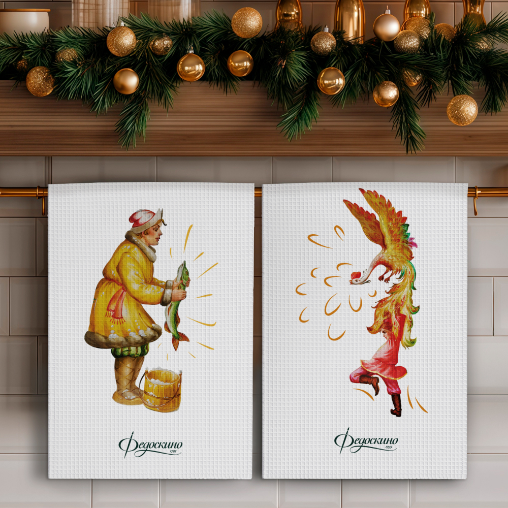 Набор Сказки о чуде "Федоскино" включает два вафельных полотенца из высококачественного хлопка, украшенных традиционными мотивами Федоскинской миниатюры. На первом полотенце застыл момент, с которого начинается самое известное русское волшебство — сказка «По щучьему веленью». Юный Иван, простодушный и чистый сердцем, только что поймал волшебную щуку. В его руках — не просто рыба, а сама исполнительница желаний, мудрая хозяйка вод. Искрящаяся чешуя, умный взгляд рыбины и изумление на лице Ивана — эта сцена говорит о главном: чудеса случаются с теми, кто верит в них и не ищет выгоды. Это история о том, что настоящее волшебство рождается из простоты и доброты.