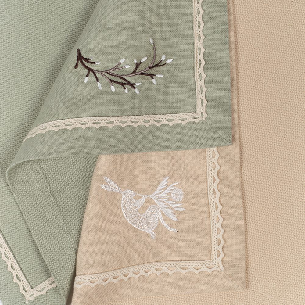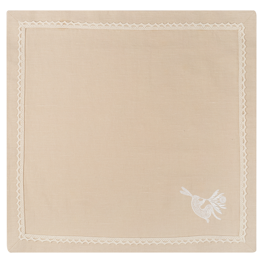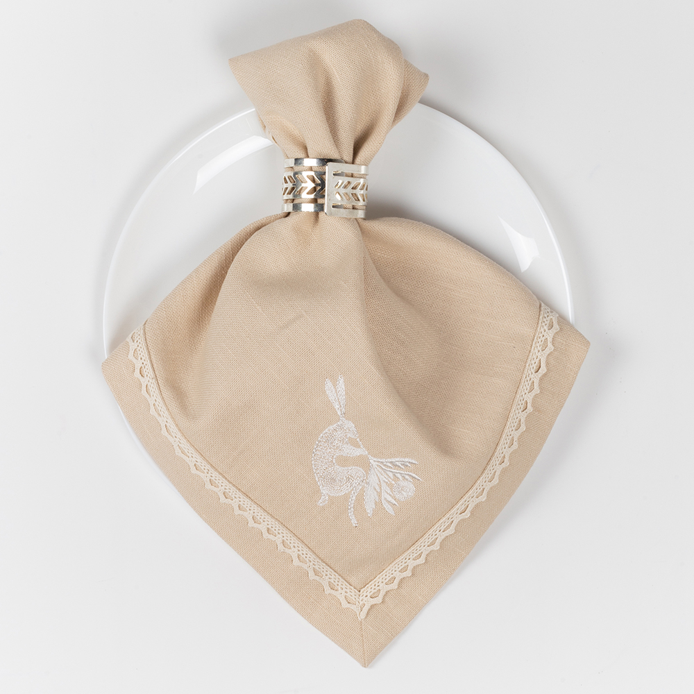 Комплект салфеток столовых с вышивкой Easter bunny (nude), имеют классическую квадратную форму, по периметру украшены изящным хлопковым кружевом молочного цвета, которое придает неповторимый французский шарм, а также оригинальной дизайнерской вышивкой в виде в виде зайчиков и цветущих веточек.