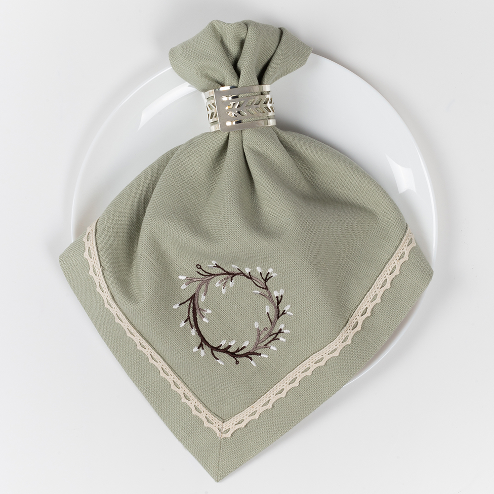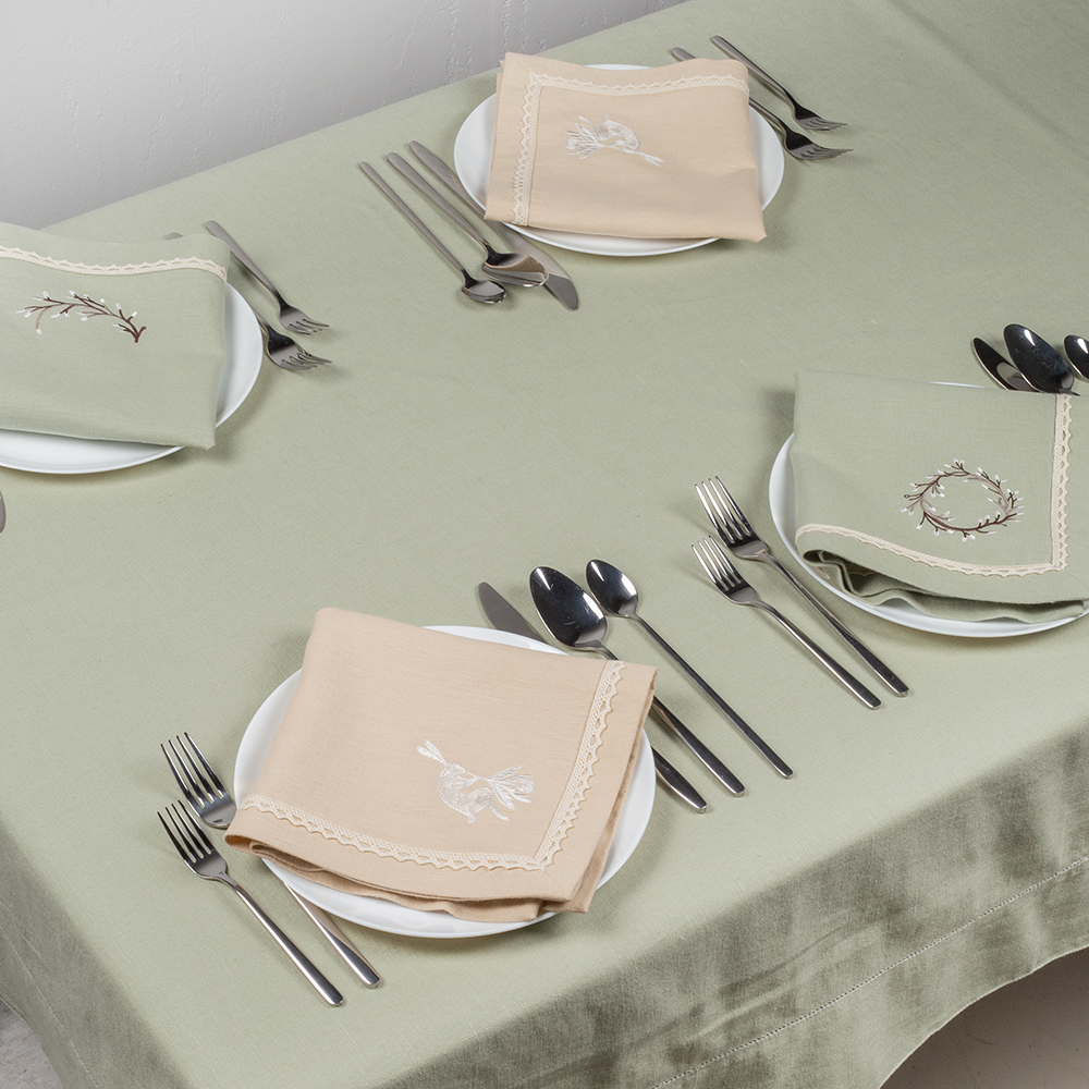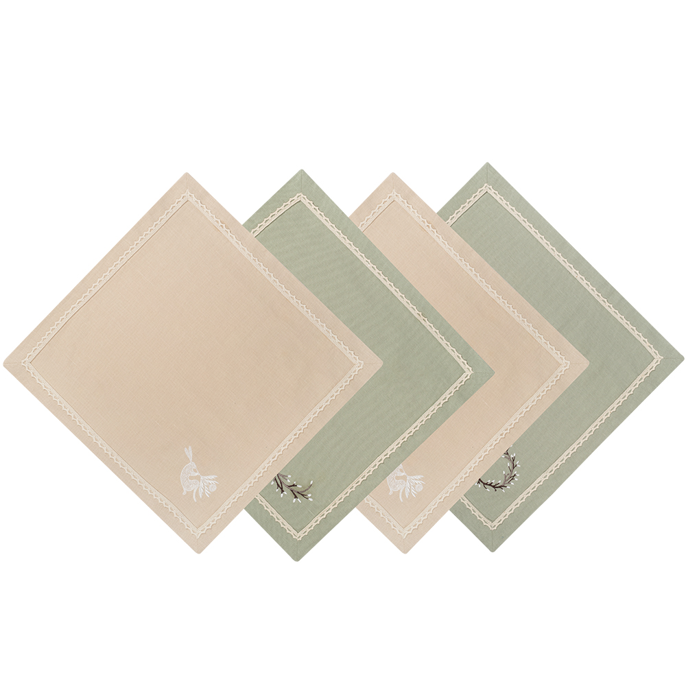 В комплект входит 4 салфетки размером 40х40 см в песочном и нежно-зеленом цвете.