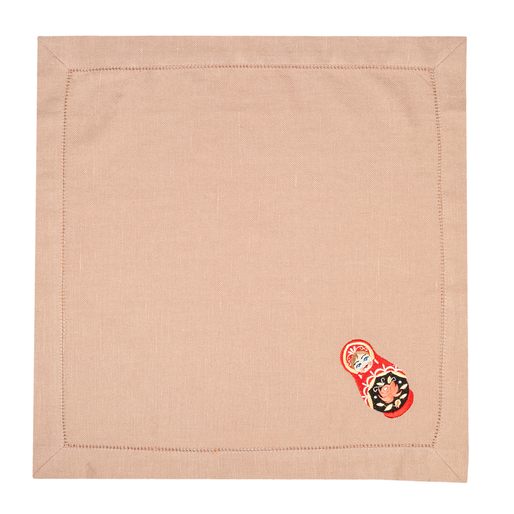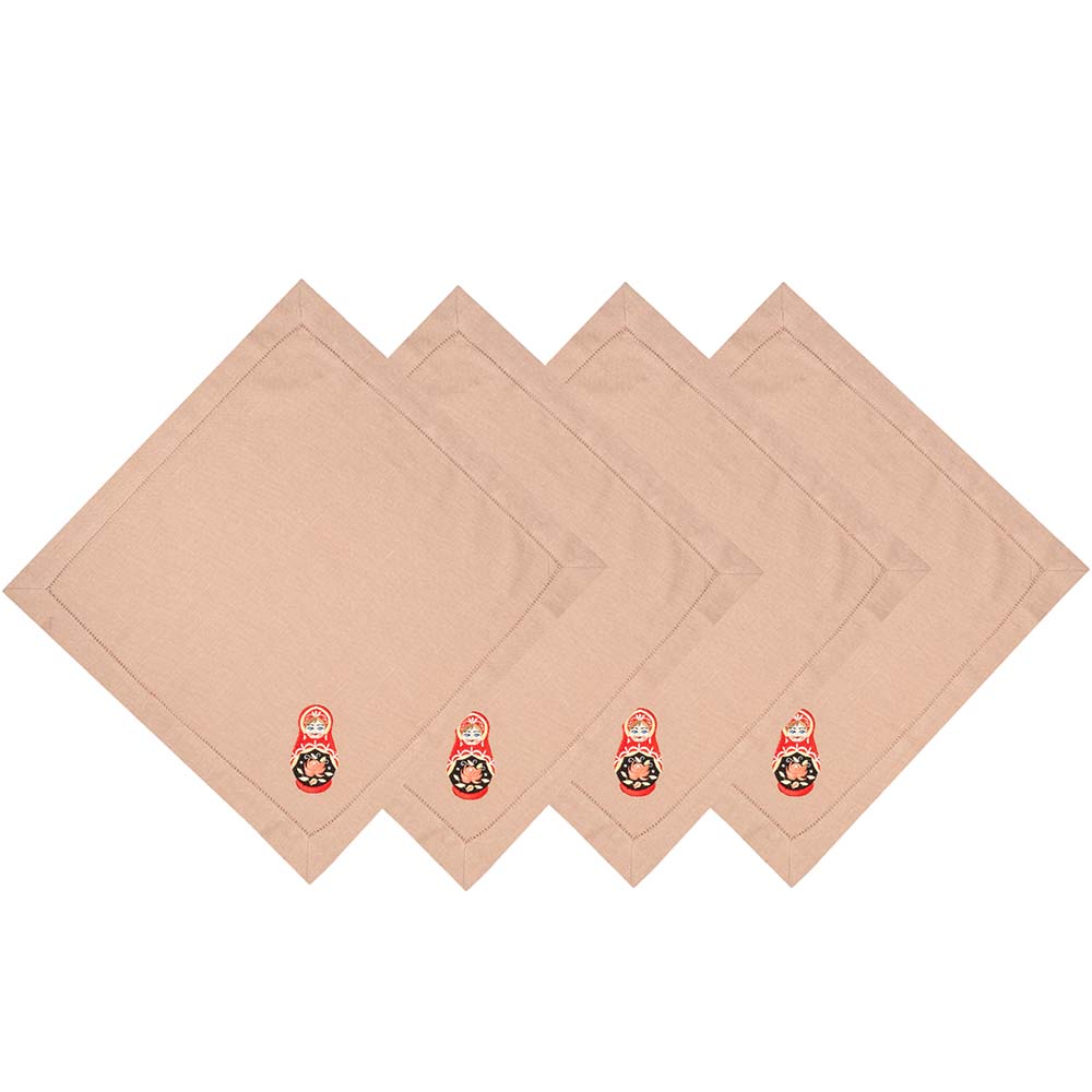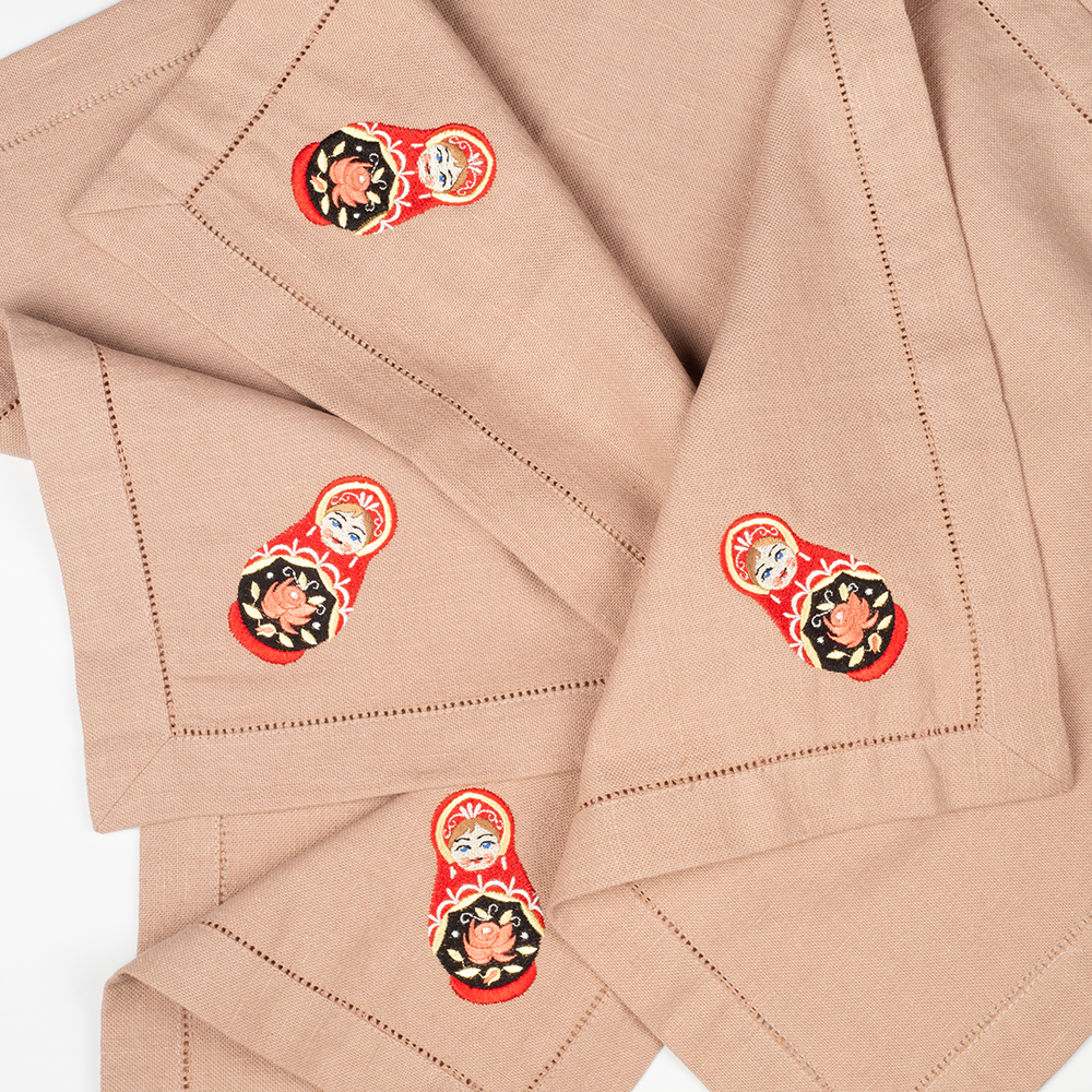 Комплект салфеток столовых с вышивкой из серии Matryoshka style, имеют классическую квадратную форму, по бордюру украшены лаконичной мережкой, и оригинальной дизайнерской вышивкой в виде в виде ярких матрешек.