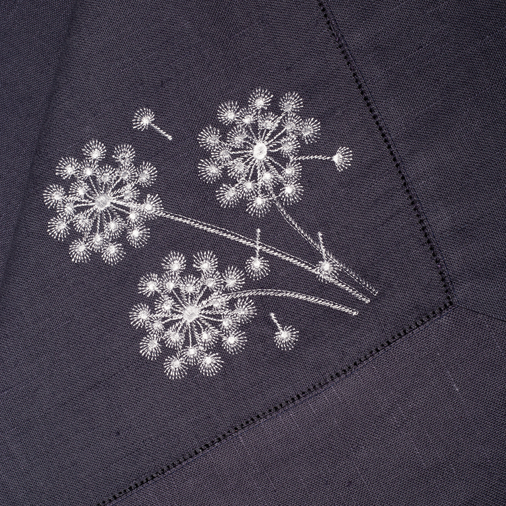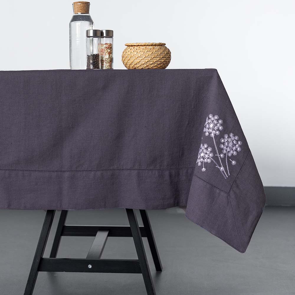 Скатерть столовая из серии Light beauty, имеет классическую прямоугольную форму, по бордюру украшена лаконичной мережкой, и оригинальной дизайнерской вышивкой в виде в виде воздушных одуванчиков.